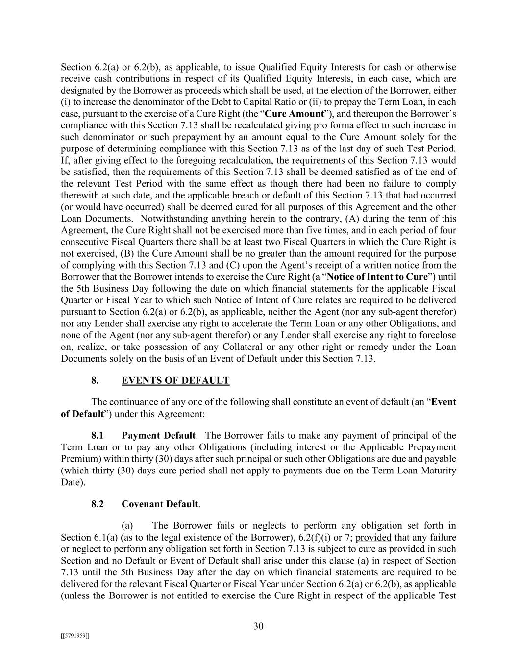 30 [[5791959]] Section 6.2(a) or 6.2(b), as applicable, to issue Qualified Equity Interests for cash or otherwise receive cash contributions in respect of its Qualified Equity Interests, in each case, which are designated by the Borrower as proceeds which shall be used, at the election of the Borrower, either (i) to increase the denominator of the Debt to Capital Ratio or (ii) to prepay the Term Loan, in each case, pursuant to the exercise of a Cure Right (the “Cure Amount”), and thereupon the Borrower’s compliance with this Section 7.13 shall be recalculated giving pro forma effect to such increase in such denominator or such prepayment by an amount equal to the Cure Amount solely for the purpose of determining compliance with this Section 7.13 as of the last day of such Test Period. If, after giving effect to the foregoing recalculation, the requirements of this Section 7.13 would be satisfied, then the requirements of this Section 7.13 shall be deemed satisfied as of the end of the relevant Test Period with the same effect as though there had been no failure to comply therewith at such date, and the applicable breach or default of this Section 7.13 that had occurred (or would have occurred) shall be deemed cured for all purposes of this Agreement and the other Loan Documents. Notwithstanding anything herein to the contrary, (A) during the term of this Agreement, the Cure Right shall not be exercised more than five times, and in each period of four consecutive Fiscal Quarters there shall be at least two Fiscal Quarters in which the Cure Right is not exercised, (B) the Cure Amount shall be no greater than the amount required for the purpose of complying with this Section 7.13 and (C) upon the Agent’s receipt of a written notice from the Borrower that the Borrower intends to exercise the Cure Right (a “Notice of Intent to Cure”) until the 5th Business Day following the date on which financial statements for the applicable Fiscal Quarter or Fiscal Year to which such Notice of Intent of Cure relates are required to be delivered pursuant to Section 6.2(a) or 6.2(b), as applicable, neither the Agent (nor any sub-agent therefor) nor any Lender shall exercise any right to accelerate the Term Loan or any other Obligations, and none of the Agent (nor any sub-agent therefor) or any Lender shall exercise any right to foreclose on, realize, or take possession of any Collateral or any other right or remedy under the Loan Documents solely on the basis of an Event of Default under this Section 7.13. 8. EVENTS OF DEFAULT The continuance of any one of the following shall constitute an event of default (an “Event of Default”) under this Agreement: 8.1 Payment Default. The Borrower fails to make any payment of principal of the Term Loan or to pay any other Obligations (including interest or the Applicable Prepayment Premium) within thirty (30) days after such principal or such other Obligations are due and payable (which thirty (30) days cure period shall not apply to payments due on the Term Loan Maturity Date). 8.2 Covenant Default. (a) The Borrower fails or neglects to perform any obligation set forth in Section 6.1(a) (as to the legal existence of the Borrower), 6.2(f)(i) or 7; provided that any failure or neglect to perform any obligation set forth in Section 7.13 is subject to cure as provided in such Section and no Default or Event of Default shall arise under this clause (a) in respect of Section 7.13 until the 5th Business Day after the day on which financial statements are required to be delivered for the relevant Fiscal Quarter or Fiscal Year under Section 6.2(a) or 6.2(b), as applicable (unless the Borrower is not entitled to exercise the Cure Right in respect of the applicable Test