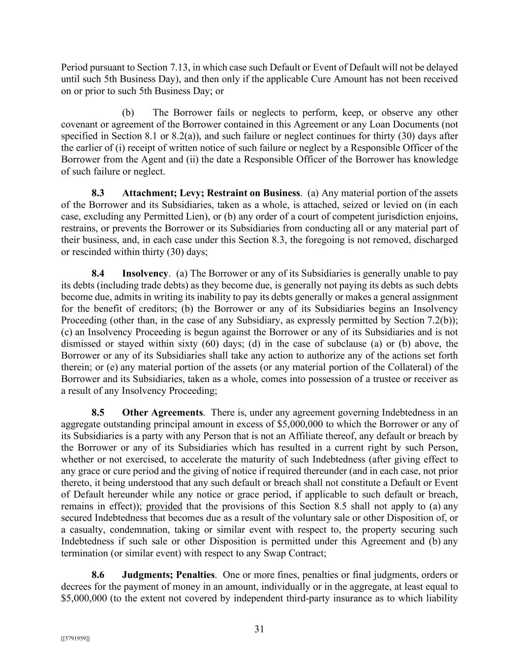 31 [[5791959]] Period pursuant to Section 7.13, in which case such Default or Event of Default will not be delayed until such 5th Business Day), and then only if the applicable Cure Amount has not been received on or prior to such 5th Business Day; or (b) The Borrower fails or neglects to perform, keep, or observe any other covenant or agreement of the Borrower contained in this Agreement or any Loan Documents (not specified in Section 8.1 or 8.2(a)), and such failure or neglect continues for thirty (30) days after the earlier of (i) receipt of written notice of such failure or neglect by a Responsible Officer of the Borrower from the Agent and (ii) the date a Responsible Officer of the Borrower has knowledge of such failure or neglect. 8.3 Attachment; Levy; Restraint on Business. (a) Any material portion of the assets of the Borrower and its Subsidiaries, taken as a whole, is attached, seized or levied on (in each case, excluding any Permitted Lien), or (b) any order of a court of competent jurisdiction enjoins, restrains, or prevents the Borrower or its Subsidiaries from conducting all or any material part of their business, and, in each case under this Section 8.3, the foregoing is not removed, discharged or rescinded within thirty (30) days; 8.4 Insolvency. (a) The Borrower or any of its Subsidiaries is generally unable to pay its debts (including trade debts) as they become due, is generally not paying its debts as such debts become due, admits in writing its inability to pay its debts generally or makes a general assignment for the benefit of creditors; (b) the Borrower or any of its Subsidiaries begins an Insolvency Proceeding (other than, in the case of any Subsidiary, as expressly permitted by Section 7.2(b)); (c) an Insolvency Proceeding is begun against the Borrower or any of its Subsidiaries and is not dismissed or stayed within sixty (60) days; (d) in the case of subclause (a) or (b) above, the Borrower or any of its Subsidiaries shall take any action to authorize any of the actions set forth therein; or (e) any material portion of the assets (or any material portion of the Collateral) of the Borrower and its Subsidiaries, taken as a whole, comes into possession of a trustee or receiver as a result of any Insolvency Proceeding; 8.5 Other Agreements. There is, under any agreement governing Indebtedness in an aggregate outstanding principal amount in excess of $5,000,000 to which the Borrower or any of its Subsidiaries is a party with any Person that is not an Affiliate thereof, any default or breach by the Borrower or any of its Subsidiaries which has resulted in a current right by such Person, whether or not exercised, to accelerate the maturity of such Indebtedness (after giving effect to any grace or cure period and the giving of notice if required thereunder (and in each case, not prior thereto, it being understood that any such default or breach shall not constitute a Default or Event of Default hereunder while any notice or grace period, if applicable to such default or breach, remains in effect)); provided that the provisions of this Section 8.5 shall not apply to (a) any secured Indebtedness that becomes due as a result of the voluntary sale or other Disposition of, or a casualty, condemnation, taking or similar event with respect to, the property securing such Indebtedness if such sale or other Disposition is permitted under this Agreement and (b) any termination (or similar event) with respect to any Swap Contract; 8.6 Judgments; Penalties. One or more fines, penalties or final judgments, orders or decrees for the payment of money in an amount, individually or in the aggregate, at least equal to $5,000,000 (to the extent not covered by independent third-party insurance as to which liability