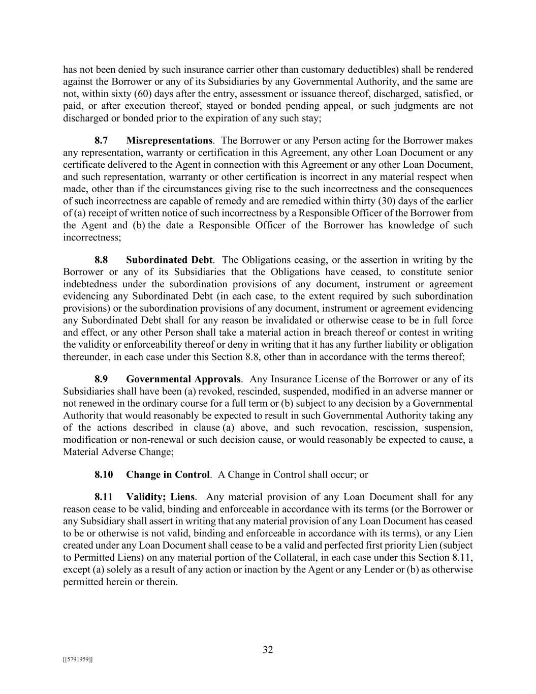 32 [[5791959]] has not been denied by such insurance carrier other than customary deductibles) shall be rendered against the Borrower or any of its Subsidiaries by any Governmental Authority, and the same are not, within sixty (60) days after the entry, assessment or issuance thereof, discharged, satisfied, or paid, or after execution thereof, stayed or bonded pending appeal, or such judgments are not discharged or bonded prior to the expiration of any such stay; 8.7 Misrepresentations. The Borrower or any Person acting for the Borrower makes any representation, warranty or certification in this Agreement, any other Loan Document or any certificate delivered to the Agent in connection with this Agreement or any other Loan Document, and such representation, warranty or other certification is incorrect in any material respect when made, other than if the circumstances giving rise to the such incorrectness and the consequences of such incorrectness are capable of remedy and are remedied within thirty (30) days of the earlier of (a) receipt of written notice of such incorrectness by a Responsible Officer of the Borrower from the Agent and (b) the date a Responsible Officer of the Borrower has knowledge of such incorrectness; 8.8 Subordinated Debt. The Obligations ceasing, or the assertion in writing by the Borrower or any of its Subsidiaries that the Obligations have ceased, to constitute senior indebtedness under the subordination provisions of any document, instrument or agreement evidencing any Subordinated Debt (in each case, to the extent required by such subordination provisions) or the subordination provisions of any document, instrument or agreement evidencing any Subordinated Debt shall for any reason be invalidated or otherwise cease to be in full force and effect, or any other Person shall take a material action in breach thereof or contest in writing the validity or enforceability thereof or deny in writing that it has any further liability or obligation thereunder, in each case under this Section 8.8, other than in accordance with the terms thereof; 8.9 Governmental Approvals. Any Insurance License of the Borrower or any of its Subsidiaries shall have been (a) revoked, rescinded, suspended, modified in an adverse manner or not renewed in the ordinary course for a full term or (b) subject to any decision by a Governmental Authority that would reasonably be expected to result in such Governmental Authority taking any of the actions described in clause (a) above, and such revocation, rescission, suspension, modification or non-renewal or such decision cause, or would reasonably be expected to cause, a Material Adverse Change; 8.10 Change in Control. A Change in Control shall occur; or 8.11 Validity; Liens. Any material provision of any Loan Document shall for any reason cease to be valid, binding and enforceable in accordance with its terms (or the Borrower or any Subsidiary shall assert in writing that any material provision of any Loan Document has ceased to be or otherwise is not valid, binding and enforceable in accordance with its terms), or any Lien created under any Loan Document shall cease to be a valid and perfected first priority Lien (subject to Permitted Liens) on any material portion of the Collateral, in each case under this Section 8.11, except (a) solely as a result of any action or inaction by the Agent or any Lender or (b) as otherwise permitted herein or therein.