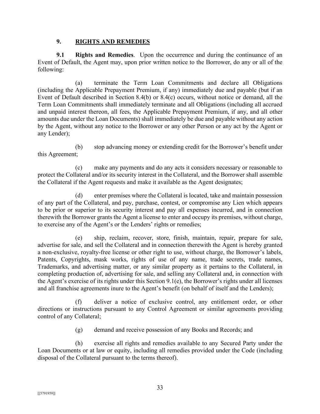33 [[5791959]] 9. RIGHTS AND REMEDIES 9.1 Rights and Remedies. Upon the occurrence and during the continuance of an Event of Default, the Agent may, upon prior written notice to the Borrower, do any or all of the following: (a) terminate the Term Loan Commitments and declare all Obligations (including the Applicable Prepayment Premium, if any) immediately due and payable (but if an Event of Default described in Section 8.4(b) or 8.4(c) occurs, without notice or demand, all the Term Loan Commitments shall immediately terminate and all Obligations (including all accrued and unpaid interest thereon, all fees, the Applicable Prepayment Premium, if any, and all other amounts due under the Loan Documents) shall immediately be due and payable without any action by the Agent, without any notice to the Borrower or any other Person or any act by the Agent or any Lender); (b) stop advancing money or extending credit for the Borrower’s benefit under this Agreement; (c) make any payments and do any acts it considers necessary or reasonable to protect the Collateral and/or its security interest in the Collateral, and the Borrower shall assemble the Collateral if the Agent requests and make it available as the Agent designates; (d) enter premises where the Collateral is located, take and maintain possession of any part of the Collateral, and pay, purchase, contest, or compromise any Lien which appears to be prior or superior to its security interest and pay all expenses incurred, and in connection therewith the Borrower grants the Agent a license to enter and occupy its premises, without charge, to exercise any of the Agent’s or the Lenders’ rights or remedies; (e) ship, reclaim, recover, store, finish, maintain, repair, prepare for sale, advertise for sale, and sell the Collateral and in connection therewith the Agent is hereby granted a non-exclusive, royalty-free license or other right to use, without charge, the Borrower’s labels, Patents, Copyrights, mask works, rights of use of any name, trade secrets, trade names, Trademarks, and advertising matter, or any similar property as it pertains to the Collateral, in completing production of, advertising for sale, and selling any Collateral and, in connection with the Agent’s exercise of its rights under this Section 9.1(e), the Borrower’s rights under all licenses and all franchise agreements inure to the Agent’s benefit (on behalf of itself and the Lenders); (f) deliver a notice of exclusive control, any entitlement order, or other directions or instructions pursuant to any Control Agreement or similar agreements providing control of any Collateral; (g) demand and receive possession of any Books and Records; and (h) exercise all rights and remedies available to any Secured Party under the Loan Documents or at law or equity, including all remedies provided under the Code (including disposal of the Collateral pursuant to the terms thereof).