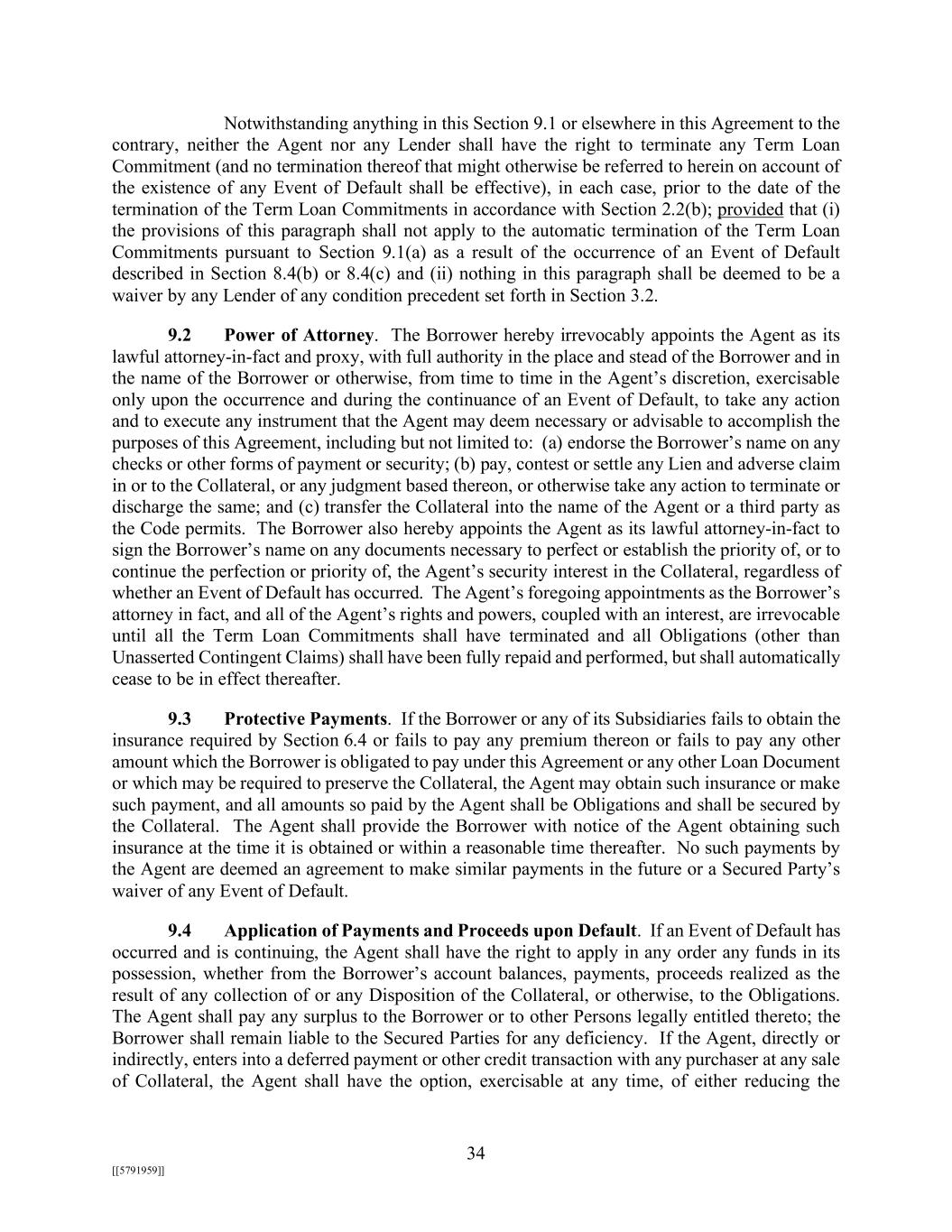 34 [[5791959]] Notwithstanding anything in this Section 9.1 or elsewhere in this Agreement to the contrary, neither the Agent nor any Lender shall have the right to terminate any Term Loan Commitment (and no termination thereof that might otherwise be referred to herein on account of the existence of any Event of Default shall be effective), in each case, prior to the date of the termination of the Term Loan Commitments in accordance with Section 2.2(b); provided that (i) the provisions of this paragraph shall not apply to the automatic termination of the Term Loan Commitments pursuant to Section 9.1(a) as a result of the occurrence of an Event of Default described in Section 8.4(b) or 8.4(c) and (ii) nothing in this paragraph shall be deemed to be a waiver by any Lender of any condition precedent set forth in Section 3.2. 9.2 Power of Attorney. The Borrower hereby irrevocably appoints the Agent as its lawful attorney-in-fact and proxy, with full authority in the place and stead of the Borrower and in the name of the Borrower or otherwise, from time to time in the Agent’s discretion, exercisable only upon the occurrence and during the continuance of an Event of Default, to take any action and to execute any instrument that the Agent may deem necessary or advisable to accomplish the purposes of this Agreement, including but not limited to: (a) endorse the Borrower’s name on any checks or other forms of payment or security; (b) pay, contest or settle any Lien and adverse claim in or to the Collateral, or any judgment based thereon, or otherwise take any action to terminate or discharge the same; and (c) transfer the Collateral into the name of the Agent or a third party as the Code permits. The Borrower also hereby appoints the Agent as its lawful attorney-in-fact to sign the Borrower’s name on any documents necessary to perfect or establish the priority of, or to continue the perfection or priority of, the Agent’s security interest in the Collateral, regardless of whether an Event of Default has occurred. The Agent’s foregoing appointments as the Borrower’s attorney in fact, and all of the Agent’s rights and powers, coupled with an interest, are irrevocable until all the Term Loan Commitments shall have terminated and all Obligations (other than Unasserted Contingent Claims) shall have been fully repaid and performed, but shall automatically cease to be in effect thereafter. 9.3 Protective Payments. If the Borrower or any of its Subsidiaries fails to obtain the insurance required by Section 6.4 or fails to pay any premium thereon or fails to pay any other amount which the Borrower is obligated to pay under this Agreement or any other Loan Document or which may be required to preserve the Collateral, the Agent may obtain such insurance or make such payment, and all amounts so paid by the Agent shall be Obligations and shall be secured by the Collateral. The Agent shall provide the Borrower with notice of the Agent obtaining such insurance at the time it is obtained or within a reasonable time thereafter. No such payments by the Agent are deemed an agreement to make similar payments in the future or a Secured Party’s waiver of any Event of Default. 9.4 Application of Payments and Proceeds upon Default. If an Event of Default has occurred and is continuing, the Agent shall have the right to apply in any order any funds in its possession, whether from the Borrower’s account balances, payments, proceeds realized as the result of any collection of or any Disposition of the Collateral, or otherwise, to the Obligations. The Agent shall pay any surplus to the Borrower or to other Persons legally entitled thereto; the Borrower shall remain liable to the Secured Parties for any deficiency. If the Agent, directly or indirectly, enters into a deferred payment or other credit transaction with any purchaser at any sale of Collateral, the Agent shall have the option, exercisable at any time, of either reducing the