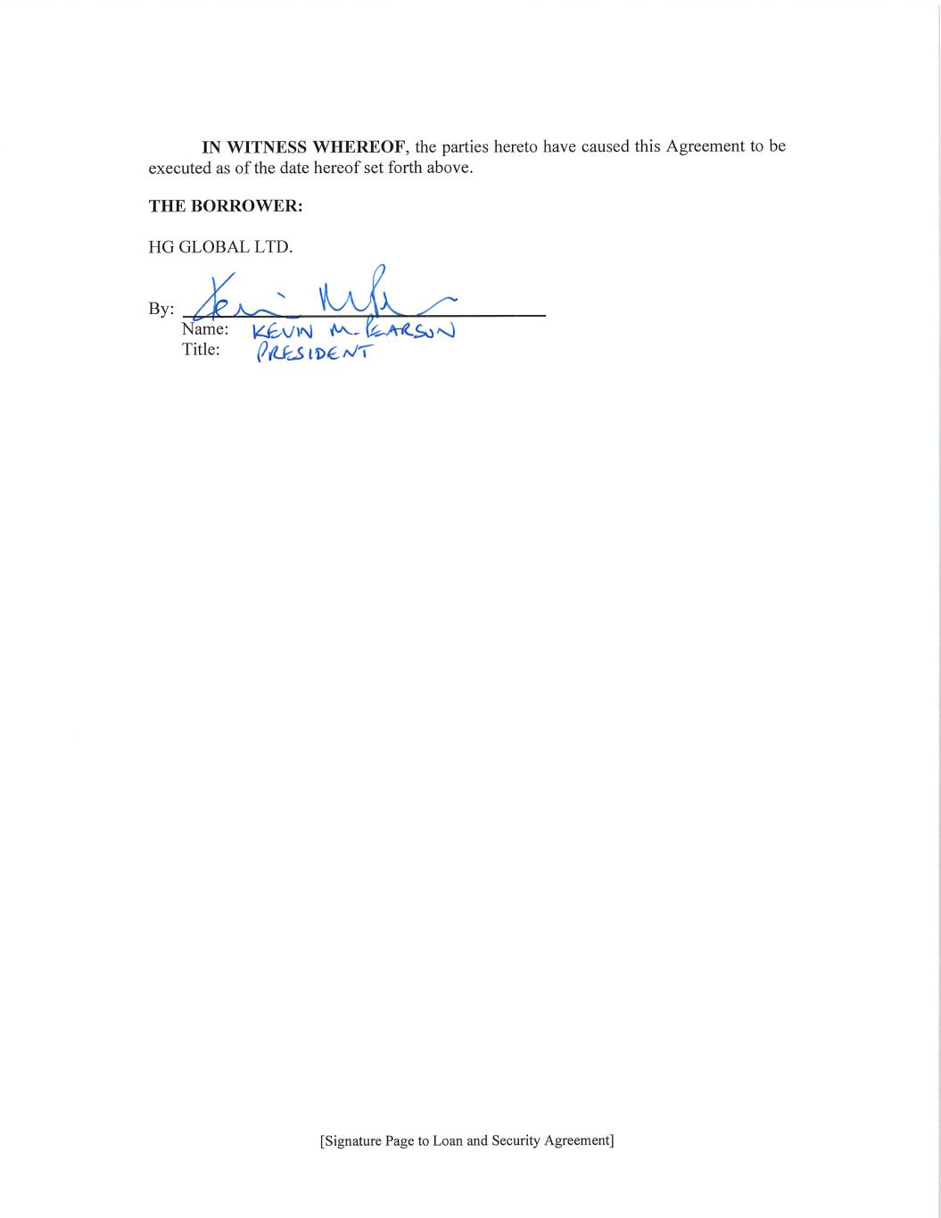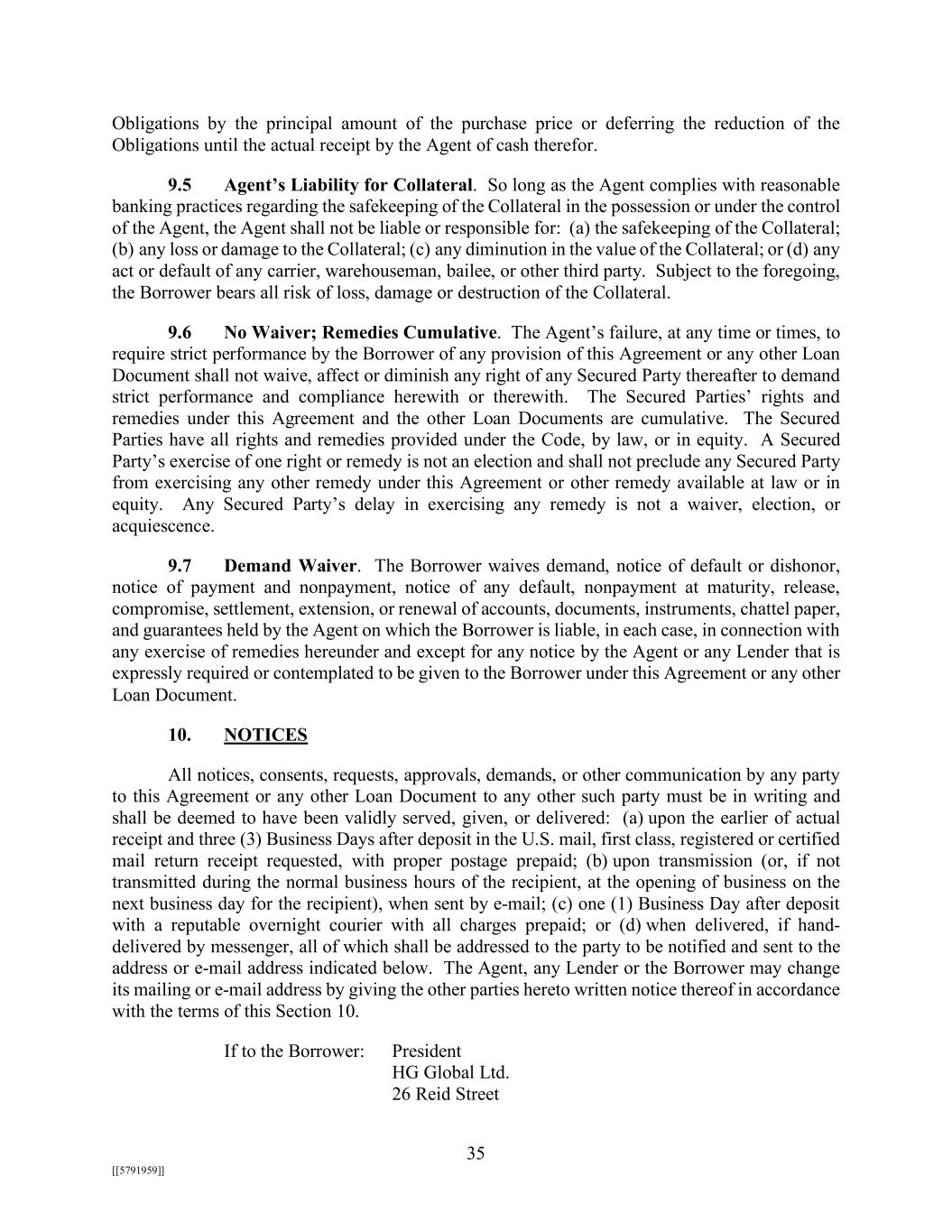 35 [[5791959]] Obligations by the principal amount of the purchase price or deferring the reduction of the Obligations until the actual receipt by the Agent of cash therefor. 9.5 Agent’s Liability for Collateral. So long as the Agent complies with reasonable banking practices regarding the safekeeping of the Collateral in the possession or under the control of the Agent, the Agent shall not be liable or responsible for: (a) the safekeeping of the Collateral; (b) any loss or damage to the Collateral; (c) any diminution in the value of the Collateral; or (d) any act or default of any carrier, warehouseman, bailee, or other third party. Subject to the foregoing, the Borrower bears all risk of loss, damage or destruction of the Collateral. 9.6 No Waiver; Remedies Cumulative. The Agent’s failure, at any time or times, to require strict performance by the Borrower of any provision of this Agreement or any other Loan Document shall not waive, affect or diminish any right of any Secured Party thereafter to demand strict performance and compliance herewith or therewith. The Secured Parties’ rights and remedies under this Agreement and the other Loan Documents are cumulative. The Secured Parties have all rights and remedies provided under the Code, by law, or in equity. A Secured Party’s exercise of one right or remedy is not an election and shall not preclude any Secured Party from exercising any other remedy under this Agreement or other remedy available at law or in equity. Any Secured Party’s delay in exercising any remedy is not a waiver, election, or acquiescence. 9.7 Demand Waiver. The Borrower waives demand, notice of default or dishonor, notice of payment and nonpayment, notice of any default, nonpayment at maturity, release, compromise, settlement, extension, or renewal of accounts, documents, instruments, chattel paper, and guarantees held by the Agent on which the Borrower is liable, in each case, in connection with any exercise of remedies hereunder and except for any notice by the Agent or any Lender that is expressly required or contemplated to be given to the Borrower under this Agreement or any other Loan Document. 10. NOTICES All notices, consents, requests, approvals, demands, or other communication by any party to this Agreement or any other Loan Document to any other such party must be in writing and shall be deemed to have been validly served, given, or delivered: (a) upon the earlier of actual receipt and three (3) Business Days after deposit in the U.S. mail, first class, registered or certified mail return receipt requested, with proper postage prepaid; (b) upon transmission (or, if not transmitted during the normal business hours of the recipient, at the opening of business on the next business day for the recipient), when sent by e-mail; (c) one (1) Business Day after deposit with a reputable overnight courier with all charges prepaid; or (d) when delivered, if hand- delivered by messenger, all of which shall be addressed to the party to be notified and sent to the address or e-mail address indicated below. The Agent, any Lender or the Borrower may change its mailing or e-mail address by giving the other parties hereto written notice thereof in accordance with the terms of this Section 10. If to the Borrower: President HG Global Ltd. 26 Reid Street