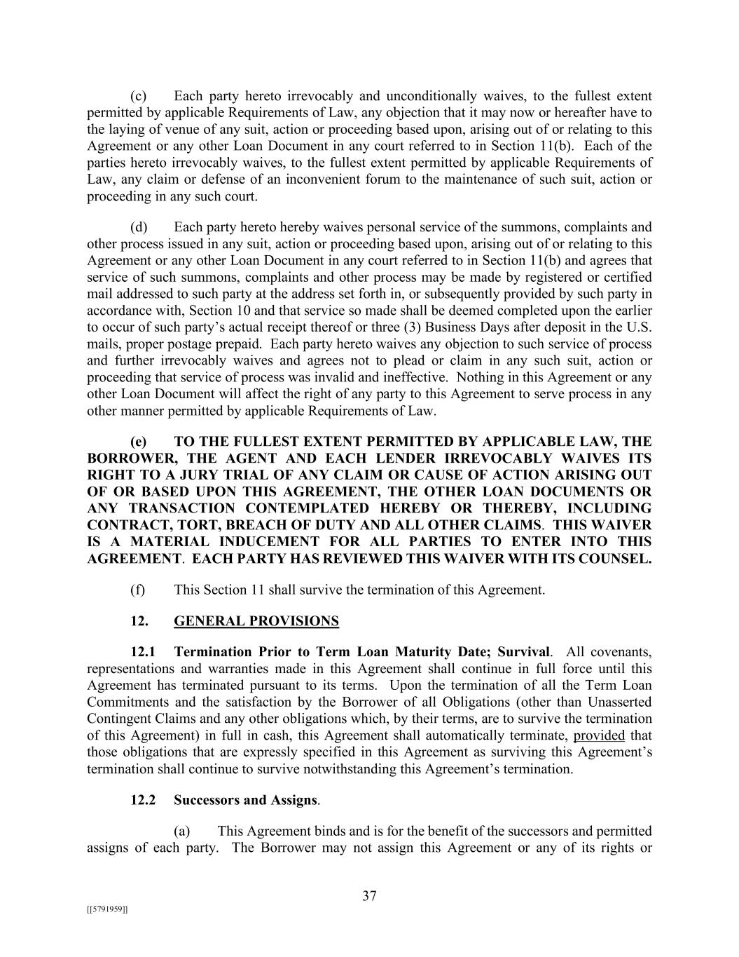 37 [[5791959]] (c) Each party hereto irrevocably and unconditionally waives, to the fullest extent permitted by applicable Requirements of Law, any objection that it may now or hereafter have to the laying of venue of any suit, action or proceeding based upon, arising out of or relating to this Agreement or any other Loan Document in any court referred to in Section 11(b). Each of the parties hereto irrevocably waives, to the fullest extent permitted by applicable Requirements of Law, any claim or defense of an inconvenient forum to the maintenance of such suit, action or proceeding in any such court. (d) Each party hereto hereby waives personal service of the summons, complaints and other process issued in any suit, action or proceeding based upon, arising out of or relating to this Agreement or any other Loan Document in any court referred to in Section 11(b) and agrees that service of such summons, complaints and other process may be made by registered or certified mail addressed to such party at the address set forth in, or subsequently provided by such party in accordance with, Section 10 and that service so made shall be deemed completed upon the earlier to occur of such party’s actual receipt thereof or three (3) Business Days after deposit in the U.S. mails, proper postage prepaid. Each party hereto waives any objection to such service of process and further irrevocably waives and agrees not to plead or claim in any such suit, action or proceeding that service of process was invalid and ineffective. Nothing in this Agreement or any other Loan Document will affect the right of any party to this Agreement to serve process in any other manner permitted by applicable Requirements of Law. (e) TO THE FULLEST EXTENT PERMITTED BY APPLICABLE LAW, THE BORROWER, THE AGENT AND EACH LENDER IRREVOCABLY WAIVES ITS RIGHT TO A JURY TRIAL OF ANY CLAIM OR CAUSE OF ACTION ARISING OUT OF OR BASED UPON THIS AGREEMENT, THE OTHER LOAN DOCUMENTS OR ANY TRANSACTION CONTEMPLATED HEREBY OR THEREBY, INCLUDING CONTRACT, TORT, BREACH OF DUTY AND ALL OTHER CLAIMS. THIS WAIVER IS A MATERIAL INDUCEMENT FOR ALL PARTIES TO ENTER INTO THIS AGREEMENT. EACH PARTY HAS REVIEWED THIS WAIVER WITH ITS COUNSEL. (f) This Section 11 shall survive the termination of this Agreement. 12. GENERAL PROVISIONS 12.1 Termination Prior to Term Loan Maturity Date; Survival. All covenants, representations and warranties made in this Agreement shall continue in full force until this Agreement has terminated pursuant to its terms. Upon the termination of all the Term Loan Commitments and the satisfaction by the Borrower of all Obligations (other than Unasserted Contingent Claims and any other obligations which, by their terms, are to survive the termination of this Agreement) in full in cash, this Agreement shall automatically terminate, provided that those obligations that are expressly specified in this Agreement as surviving this Agreement’s termination shall continue to survive notwithstanding this Agreement’s termination. 12.2 Successors and Assigns. (a) This Agreement binds and is for the benefit of the successors and permitted assigns of each party. The Borrower may not assign this Agreement or any of its rights or
