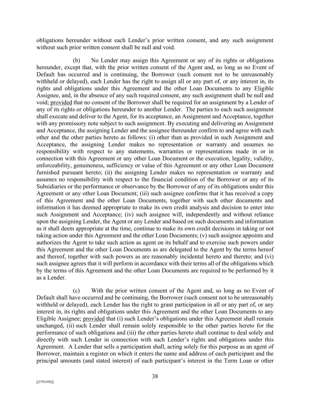 38 [[5791959]] obligations hereunder without each Lender’s prior written consent, and any such assignment without such prior written consent shall be null and void. (b) No Lender may assign this Agreement or any of its rights or obligations hereunder, except that, with the prior written consent of the Agent and, so long as no Event of Default has occurred and is continuing, the Borrower (such consent not to be unreasonably withheld or delayed), each Lender has the right to assign all or any part of, or any interest in, its rights and obligations under this Agreement and the other Loan Documents to any Eligible Assignee, and, in the absence of any such required consent, any such assignment shall be null and void; provided that no consent of the Borrower shall be required for an assignment by a Lender of any of its rights or obligations hereunder to another Lender. The parties to each such assignment shall execute and deliver to the Agent, for its acceptance, an Assignment and Acceptance, together with any promissory note subject to such assignment. By executing and delivering an Assignment and Acceptance, the assigning Lender and the assignee thereunder confirm to and agree with each other and the other parties hereto as follows: (i) other than as provided in such Assignment and Acceptance, the assigning Lender makes no representation or warranty and assumes no responsibility with respect to any statements, warranties or representations made in or in connection with this Agreement or any other Loan Document or the execution, legality, validity, enforceability, genuineness, sufficiency or value of this Agreement or any other Loan Document furnished pursuant hereto; (ii) the assigning Lender makes no representation or warranty and assumes no responsibility with respect to the financial condition of the Borrower or any of its Subsidiaries or the performance or observance by the Borrower of any of its obligations under this Agreement or any other Loan Document; (iii) such assignee confirms that it has received a copy of this Agreement and the other Loan Documents, together with such other documents and information it has deemed appropriate to make its own credit analysis and decision to enter into such Assignment and Acceptance; (iv) such assignee will, independently and without reliance upon the assigning Lender, the Agent or any Lender and based on such documents and information as it shall deem appropriate at the time, continue to make its own credit decisions in taking or not taking action under this Agreement and the other Loan Documents; (v) such assignee appoints and authorizes the Agent to take such action as agent on its behalf and to exercise such powers under this Agreement and the other Loan Documents as are delegated to the Agent by the terms hereof and thereof, together with such powers as are reasonably incidental hereto and thereto; and (vi) such assignee agrees that it will perform in accordance with their terms all of the obligations which by the terms of this Agreement and the other Loan Documents are required to be performed by it as a Lender. (c) With the prior written consent of the Agent and, so long as no Event of Default shall have occurred and be continuing, the Borrower (such consent not to be unreasonably withheld or delayed), each Lender has the right to grant participation in all or any part of, or any interest in, its rights and obligations under this Agreement and the other Loan Documents to any Eligible Assignee; provided that (i) such Lender’s obligations under this Agreement shall remain unchanged, (ii) such Lender shall remain solely responsible to the other parties hereto for the performance of such obligations and (iii) the other parties hereto shall continue to deal solely and directly with such Lender in connection with such Lender’s rights and obligations under this Agreement. A Lender that sells a participation shall, acting solely for this purpose as an agent of Borrower, maintain a register on which it enters the name and address of each participant and the principal amounts (and stated interest) of each participant’s interest in the Term Loan or other