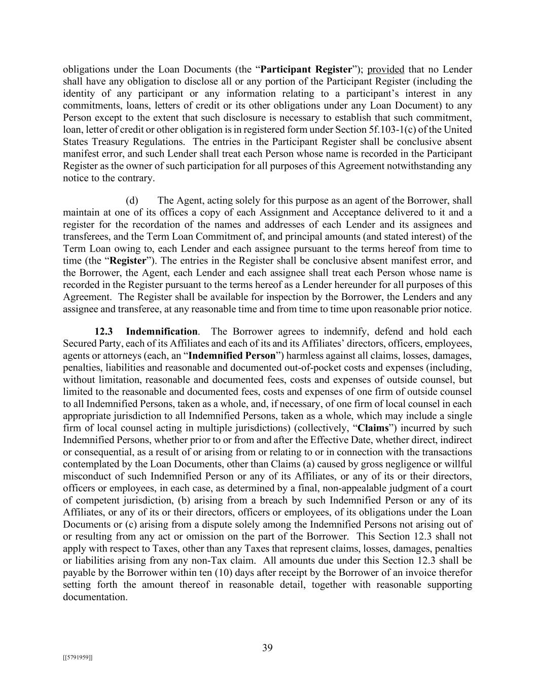 39 [[5791959]] obligations under the Loan Documents (the “Participant Register”); provided that no Lender shall have any obligation to disclose all or any portion of the Participant Register (including the identity of any participant or any information relating to a participant’s interest in any commitments, loans, letters of credit or its other obligations under any Loan Document) to any Person except to the extent that such disclosure is necessary to establish that such commitment, loan, letter of credit or other obligation is in registered form under Section 5f.103-1(c) of the United States Treasury Regulations. The entries in the Participant Register shall be conclusive absent manifest error, and such Lender shall treat each Person whose name is recorded in the Participant Register as the owner of such participation for all purposes of this Agreement notwithstanding any notice to the contrary. (d) The Agent, acting solely for this purpose as an agent of the Borrower, shall maintain at one of its offices a copy of each Assignment and Acceptance delivered to it and a register for the recordation of the names and addresses of each Lender and its assignees and transferees, and the Term Loan Commitment of, and principal amounts (and stated interest) of the Term Loan owing to, each Lender and each assignee pursuant to the terms hereof from time to time (the “Register”). The entries in the Register shall be conclusive absent manifest error, and the Borrower, the Agent, each Lender and each assignee shall treat each Person whose name is recorded in the Register pursuant to the terms hereof as a Lender hereunder for all purposes of this Agreement. The Register shall be available for inspection by the Borrower, the Lenders and any assignee and transferee, at any reasonable time and from time to time upon reasonable prior notice. 12.3 Indemnification. The Borrower agrees to indemnify, defend and hold each Secured Party, each of its Affiliates and each of its and its Affiliates’ directors, officers, employees, agents or attorneys (each, an “Indemnified Person”) harmless against all claims, losses, damages, penalties, liabilities and reasonable and documented out-of-pocket costs and expenses (including, without limitation, reasonable and documented fees, costs and expenses of outside counsel, but limited to the reasonable and documented fees, costs and expenses of one firm of outside counsel to all Indemnified Persons, taken as a whole, and, if necessary, of one firm of local counsel in each appropriate jurisdiction to all Indemnified Persons, taken as a whole, which may include a single firm of local counsel acting in multiple jurisdictions) (collectively, “Claims”) incurred by such Indemnified Persons, whether prior to or from and after the Effective Date, whether direct, indirect or consequential, as a result of or arising from or relating to or in connection with the transactions contemplated by the Loan Documents, other than Claims (a) caused by gross negligence or willful misconduct of such Indemnified Person or any of its Affiliates, or any of its or their directors, officers or employees, in each case, as determined by a final, non-appealable judgment of a court of competent jurisdiction, (b) arising from a breach by such Indemnified Person or any of its Affiliates, or any of its or their directors, officers or employees, of its obligations under the Loan Documents or (c) arising from a dispute solely among the Indemnified Persons not arising out of or resulting from any act or omission on the part of the Borrower. This Section 12.3 shall not apply with respect to Taxes, other than any Taxes that represent claims, losses, damages, penalties or liabilities arising from any non-Tax claim. All amounts due under this Section 12.3 shall be payable by the Borrower within ten (10) days after receipt by the Borrower of an invoice therefor setting forth the amount thereof in reasonable detail, together with reasonable supporting documentation.
