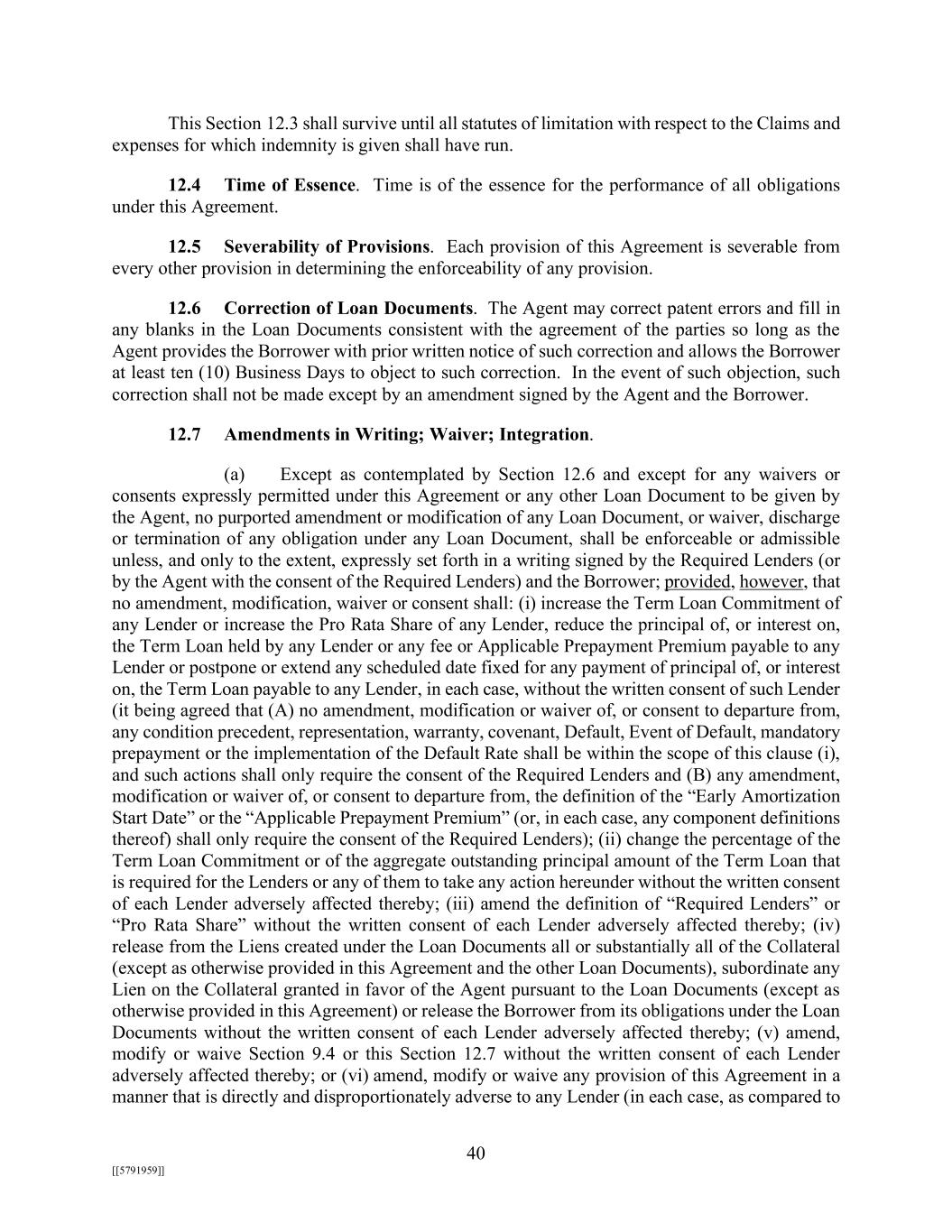 40 [[5791959]] This Section 12.3 shall survive until all statutes of limitation with respect to the Claims and expenses for which indemnity is given shall have run. 12.4 Time of Essence. Time is of the essence for the performance of all obligations under this Agreement. 12.5 Severability of Provisions. Each provision of this Agreement is severable from every other provision in determining the enforceability of any provision. 12.6 Correction of Loan Documents. The Agent may correct patent errors and fill in any blanks in the Loan Documents consistent with the agreement of the parties so long as the Agent provides the Borrower with prior written notice of such correction and allows the Borrower at least ten (10) Business Days to object to such correction. In the event of such objection, such correction shall not be made except by an amendment signed by the Agent and the Borrower. 12.7 Amendments in Writing; Waiver; Integration. (a) Except as contemplated by Section 12.6 and except for any waivers or consents expressly permitted under this Agreement or any other Loan Document to be given by the Agent, no purported amendment or modification of any Loan Document, or waiver, discharge or termination of any obligation under any Loan Document, shall be enforceable or admissible unless, and only to the extent, expressly set forth in a writing signed by the Required Lenders (or by the Agent with the consent of the Required Lenders) and the Borrower; provided, however, that no amendment, modification, waiver or consent shall: (i) increase the Term Loan Commitment of any Lender or increase the Pro Rata Share of any Lender, reduce the principal of, or interest on, the Term Loan held by any Lender or any fee or Applicable Prepayment Premium payable to any Lender or postpone or extend any scheduled date fixed for any payment of principal of, or interest on, the Term Loan payable to any Lender, in each case, without the written consent of such Lender (it being agreed that (A) no amendment, modification or waiver of, or consent to departure from, any condition precedent, representation, warranty, covenant, Default, Event of Default, mandatory prepayment or the implementation of the Default Rate shall be within the scope of this clause (i), and such actions shall only require the consent of the Required Lenders and (B) any amendment, modification or waiver of, or consent to departure from, the definition of the “Early Amortization Start Date” or the “Applicable Prepayment Premium” (or, in each case, any component definitions thereof) shall only require the consent of the Required Lenders); (ii) change the percentage of the Term Loan Commitment or of the aggregate outstanding principal amount of the Term Loan that is required for the Lenders or any of them to take any action hereunder without the written consent of each Lender adversely affected thereby; (iii) amend the definition of “Required Lenders” or “Pro Rata Share” without the written consent of each Lender adversely affected thereby; (iv) release from the Liens created under the Loan Documents all or substantially all of the Collateral (except as otherwise provided in this Agreement and the other Loan Documents), subordinate any Lien on the Collateral granted in favor of the Agent pursuant to the Loan Documents (except as otherwise provided in this Agreement) or release the Borrower from its obligations under the Loan Documents without the written consent of each Lender adversely affected thereby; (v) amend, modify or waive Section 9.4 or this Section 12.7 without the written consent of each Lender adversely affected thereby; or (vi) amend, modify or waive any provision of this Agreement in a manner that is directly and disproportionately adverse to any Lender (in each case, as compared to