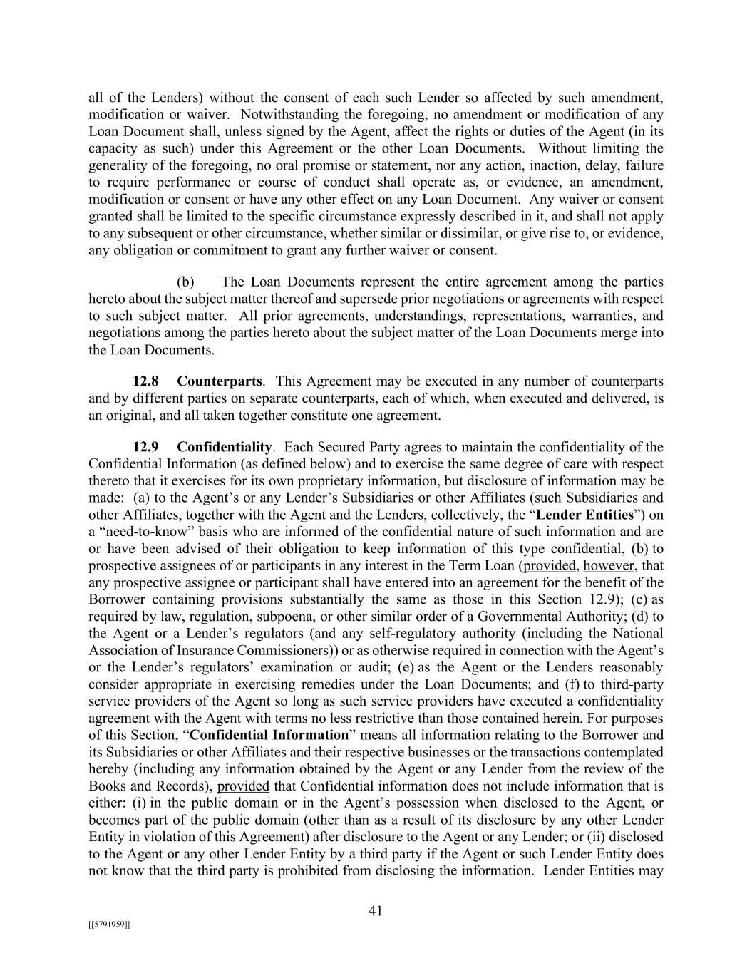 41 [[5791959]] all of the Lenders) without the consent of each such Lender so affected by such amendment, modification or waiver. Notwithstanding the foregoing, no amendment or modification of any Loan Document shall, unless signed by the Agent, affect the rights or duties of the Agent (in its capacity as such) under this Agreement or the other Loan Documents. Without limiting the generality of the foregoing, no oral promise or statement, nor any action, inaction, delay, failure to require performance or course of conduct shall operate as, or evidence, an amendment, modification or consent or have any other effect on any Loan Document. Any waiver or consent granted shall be limited to the specific circumstance expressly described in it, and shall not apply to any subsequent or other circumstance, whether similar or dissimilar, or give rise to, or evidence, any obligation or commitment to grant any further waiver or consent. (b) The Loan Documents represent the entire agreement among the parties hereto about the subject matter thereof and supersede prior negotiations or agreements with respect to such subject matter. All prior agreements, understandings, representations, warranties, and negotiations among the parties hereto about the subject matter of the Loan Documents merge into the Loan Documents. 12.8 Counterparts. This Agreement may be executed in any number of counterparts and by different parties on separate counterparts, each of which, when executed and delivered, is an original, and all taken together constitute one agreement. 12.9 Confidentiality. Each Secured Party agrees to maintain the confidentiality of the Confidential Information (as defined below) and to exercise the same degree of care with respect thereto that it exercises for its own proprietary information, but disclosure of information may be made: (a) to the Agent’s or any Lender’s Subsidiaries or other Affiliates (such Subsidiaries and other Affiliates, together with the Agent and the Lenders, collectively, the “Lender Entities”) on a “need-to-know” basis who are informed of the confidential nature of such information and are or have been advised of their obligation to keep information of this type confidential, (b) to prospective assignees of or participants in any interest in the Term Loan (provided, however, that any prospective assignee or participant shall have entered into an agreement for the benefit of the Borrower containing provisions substantially the same as those in this Section 12.9); (c) as required by law, regulation, subpoena, or other similar order of a Governmental Authority; (d) to the Agent or a Lender’s regulators (and any self-regulatory authority (including the National Association of Insurance Commissioners)) or as otherwise required in connection with the Agent’s or the Lender’s regulators’ examination or audit; (e) as the Agent or the Lenders reasonably consider appropriate in exercising remedies under the Loan Documents; and (f) to third-party service providers of the Agent so long as such service providers have executed a confidentiality agreement with the Agent with terms no less restrictive than those contained herein. For purposes of this Section, “Confidential Information” means all information relating to the Borrower and its Subsidiaries or other Affiliates and their respective businesses or the transactions contemplated hereby (including any information obtained by the Agent or any Lender from the review of the Books and Records), provided that Confidential information does not include information that is either: (i) in the public domain or in the Agent’s possession when disclosed to the Agent, or becomes part of the public domain (other than as a result of its disclosure by any other Lender Entity in violation of this Agreement) after disclosure to the Agent or any Lender; or (ii) disclosed to the Agent or any other Lender Entity by a third party if the Agent or such Lender Entity does not know that the third party is prohibited from disclosing the information. Lender Entities may