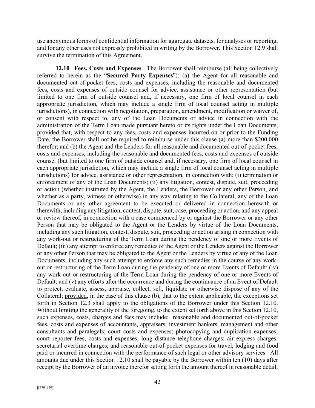 42 [[5791959]] use anonymous forms of confidential information for aggregate datasets, for analyses or reporting, and for any other uses not expressly prohibited in writing by the Borrower. This Section 12.9 shall survive the termination of this Agreement. 12.10 Fees, Costs and Expenses. The Borrower shall reimburse (all being collectively referred to herein as the “Secured Party Expenses”): (a) the Agent for all reasonable and documented out-of-pocket fees, costs and expenses, including the reasonable and documented fees, costs and expenses of outside counsel for advice, assistance or other representation (but limited to one firm of outside counsel and, if necessary, one firm of local counsel in each appropriate jurisdiction, which may include a single firm of local counsel acting in multiple jurisdictions), in connection with negotiation, preparation, amendment, modification or waiver of, or consent with respect to, any of the Loan Documents or advice in connection with the administration of the Term Loan made pursuant hereto or its rights under the Loan Documents, provided that, with respect to any fees, costs and expenses incurred on or prior to the Funding Date, the Borrower shall not be required to reimburse under this clause (a) more than $200,000 therefor; and (b) the Agent and the Lenders for all reasonable and documented out-of-pocket fees, costs and expenses, including the reasonable and documented fees, costs and expenses of outside counsel (but limited to one firm of outside counsel and, if necessary, one firm of local counsel in each appropriate jurisdiction, which may include a single firm of local counsel acting in multiple jurisdictions) for advice, assistance or other representation, in connection with: (i) termination or enforcement of any of the Loan Documents; (ii) any litigation, contest, dispute, suit, proceeding or action (whether instituted by the Agent, the Lenders, the Borrower or any other Person, and whether as a party, witness or otherwise) in any way relating to the Collateral, any of the Loan Documents or any other agreement to be executed or delivered in connection herewith or therewith, including any litigation, contest, dispute, suit, case, proceeding or action, and any appeal or review thereof, in connection with a case commenced by or against the Borrower or any other Person that may be obligated to the Agent or the Lenders by virtue of the Loan Documents, including any such litigation, contest, dispute, suit, proceeding or action arising in connection with any work-out or restructuring of the Term Loan during the pendency of one or more Events of Default; (iii) any attempt to enforce any remedies of the Agent or the Lenders against the Borrower or any other Person that may be obligated to the Agent or the Lenders by virtue of any of the Loan Documents, including any such attempt to enforce any such remedies in the course of any work- out or restructuring of the Term Loan during the pendency of one or more Events of Default; (iv) any work-out or restructuring of the Term Loan during the pendency of one or more Events of Default; and (v) any efforts after the occurrence and during the continuance of an Event of Default to protect, evaluate, assess, appraise, collect, sell, liquidate or otherwise dispose of any of the Collateral; provided, in the case of this clause (b), that to the extent applicable, the exceptions set forth in Section 12.3 shall apply to the obligations of the Borrower under this Section 12.10. Without limiting the generality of the foregoing, to the extent set forth above in this Section 12.10, such expenses, costs, charges and fees may include: reasonable and documented out-of-pocket fees, costs and expenses of accountants, appraisers, investment bankers, management and other consultants and paralegals; court costs and expenses; photocopying and duplication expenses; court reporter fees, costs and expenses; long distance telephone charges; air express charges; secretarial overtime charges; and reasonable out-of-pocket expenses for travel, lodging and food paid or incurred in connection with the performance of such legal or other advisory services. All amounts due under this Section 12.10 shall be payable by the Borrower within ten (10) days after receipt by the Borrower of an invoice therefor setting forth the amount thereof in reasonable detail,