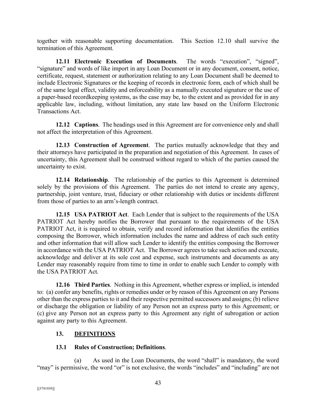43 [[5791959]] together with reasonable supporting documentation. This Section 12.10 shall survive the termination of this Agreement. 12.11 Electronic Execution of Documents. The words “execution”, “signed”, “signature” and words of like import in any Loan Document or in any document, consent, notice, certificate, request, statement or authorization relating to any Loan Document shall be deemed to include Electronic Signatures or the keeping of records in electronic form, each of which shall be of the same legal effect, validity and enforceability as a manually executed signature or the use of a paper-based recordkeeping systems, as the case may be, to the extent and as provided for in any applicable law, including, without limitation, any state law based on the Uniform Electronic Transactions Act. 12.12 Captions. The headings used in this Agreement are for convenience only and shall not affect the interpretation of this Agreement. 12.13 Construction of Agreement. The parties mutually acknowledge that they and their attorneys have participated in the preparation and negotiation of this Agreement. In cases of uncertainty, this Agreement shall be construed without regard to which of the parties caused the uncertainty to exist. 12.14 Relationship. The relationship of the parties to this Agreement is determined solely by the provisions of this Agreement. The parties do not intend to create any agency, partnership, joint venture, trust, fiduciary or other relationship with duties or incidents different from those of parties to an arm’s-length contract. 12.15 USA PATRIOT Act. Each Lender that is subject to the requirements of the USA PATRIOT Act hereby notifies the Borrower that pursuant to the requirements of the USA PATRIOT Act, it is required to obtain, verify and record information that identifies the entities composing the Borrower, which information includes the name and address of each such entity and other information that will allow such Lender to identify the entities composing the Borrower in accordance with the USA PATRIOT Act. The Borrower agrees to take such action and execute, acknowledge and deliver at its sole cost and expense, such instruments and documents as any Lender may reasonably require from time to time in order to enable such Lender to comply with the USA PATRIOT Act. 12.16 Third Parties. Nothing in this Agreement, whether express or implied, is intended to: (a) confer any benefits, rights or remedies under or by reason of this Agreement on any Persons other than the express parties to it and their respective permitted successors and assigns; (b) relieve or discharge the obligation or liability of any Person not an express party to this Agreement; or (c) give any Person not an express party to this Agreement any right of subrogation or action against any party to this Agreement. 13. DEFINITIONS 13.1 Rules of Construction; Definitions. (a) As used in the Loan Documents, the word “shall” is mandatory, the word “may” is permissive, the word “or” is not exclusive, the words “includes” and “including” are not