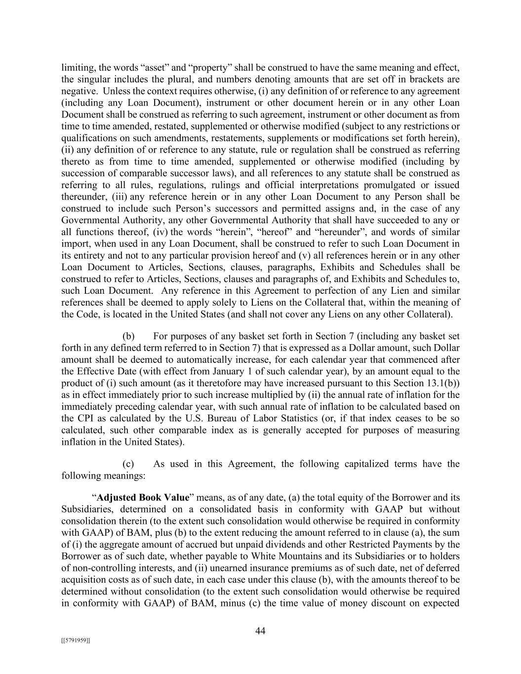 44 [[5791959]] limiting, the words “asset” and “property” shall be construed to have the same meaning and effect, the singular includes the plural, and numbers denoting amounts that are set off in brackets are negative. Unless the context requires otherwise, (i) any definition of or reference to any agreement (including any Loan Document), instrument or other document herein or in any other Loan Document shall be construed as referring to such agreement, instrument or other document as from time to time amended, restated, supplemented or otherwise modified (subject to any restrictions or qualifications on such amendments, restatements, supplements or modifications set forth herein), (ii) any definition of or reference to any statute, rule or regulation shall be construed as referring thereto as from time to time amended, supplemented or otherwise modified (including by succession of comparable successor laws), and all references to any statute shall be construed as referring to all rules, regulations, rulings and official interpretations promulgated or issued thereunder, (iii) any reference herein or in any other Loan Document to any Person shall be construed to include such Person’s successors and permitted assigns and, in the case of any Governmental Authority, any other Governmental Authority that shall have succeeded to any or all functions thereof, (iv) the words “herein”, “hereof” and “hereunder”, and words of similar import, when used in any Loan Document, shall be construed to refer to such Loan Document in its entirety and not to any particular provision hereof and (v) all references herein or in any other Loan Document to Articles, Sections, clauses, paragraphs, Exhibits and Schedules shall be construed to refer to Articles, Sections, clauses and paragraphs of, and Exhibits and Schedules to, such Loan Document. Any reference in this Agreement to perfection of any Lien and similar references shall be deemed to apply solely to Liens on the Collateral that, within the meaning of the Code, is located in the United States (and shall not cover any Liens on any other Collateral). (b) For purposes of any basket set forth in Section 7 (including any basket set forth in any defined term referred to in Section 7) that is expressed as a Dollar amount, such Dollar amount shall be deemed to automatically increase, for each calendar year that commenced after the Effective Date (with effect from January 1 of such calendar year), by an amount equal to the product of (i) such amount (as it theretofore may have increased pursuant to this Section 13.1(b)) as in effect immediately prior to such increase multiplied by (ii) the annual rate of inflation for the immediately preceding calendar year, with such annual rate of inflation to be calculated based on the CPI as calculated by the U.S. Bureau of Labor Statistics (or, if that index ceases to be so calculated, such other comparable index as is generally accepted for purposes of measuring inflation in the United States). (c) As used in this Agreement, the following capitalized terms have the following meanings: “Adjusted Book Value” means, as of any date, (a) the total equity of the Borrower and its Subsidiaries, determined on a consolidated basis in conformity with GAAP but without consolidation therein (to the extent such consolidation would otherwise be required in conformity with GAAP) of BAM, plus (b) to the extent reducing the amount referred to in clause (a), the sum of (i) the aggregate amount of accrued but unpaid dividends and other Restricted Payments by the Borrower as of such date, whether payable to White Mountains and its Subsidiaries or to holders of non-controlling interests, and (ii) unearned insurance premiums as of such date, net of deferred acquisition costs as of such date, in each case under this clause (b), with the amounts thereof to be determined without consolidation (to the extent such consolidation would otherwise be required in conformity with GAAP) of BAM, minus (c) the time value of money discount on expected