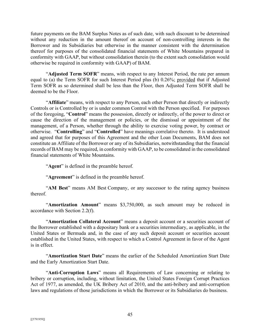 45 [[5791959]] future payments on the BAM Surplus Notes as of such date, with such discount to be determined without any reduction in the amount thereof on account of non-controlling interests in the Borrower and its Subsidiaries but otherwise in the manner consistent with the determination thereof for purposes of the consolidated financial statements of White Mountains prepared in conformity with GAAP, but without consolidation therein (to the extent such consolidation would otherwise be required in conformity with GAAP) of BAM. “Adjusted Term SOFR” means, with respect to any Interest Period, the rate per annum equal to (a) the Term SOFR for such Interest Period plus (b) 0.26%; provided that if Adjusted Term SOFR as so determined shall be less than the Floor, then Adjusted Term SOFR shall be deemed to be the Floor. “Affiliate” means, with respect to any Person, each other Person that directly or indirectly Controls or is Controlled by or is under common Control with the Person specified. For purposes of the foregoing, “Control” means the possession, directly or indirectly, of the power to direct or cause the direction of the management or policies, or the dismissal or appointment of the management, of a Person, whether through the ability to exercise voting power, by contract or otherwise. “Controlling” and “Controlled” have meanings correlative thereto. It is understood and agreed that for purposes of this Agreement and the other Loan Documents, BAM does not constitute an Affiliate of the Borrower or any of its Subsidiaries, notwithstanding that the financial records of BAM may be required, in conformity with GAAP, to be consolidated in the consolidated financial statements of White Mountains. “Agent” is defined in the preamble hereof. “Agreement” is defined in the preamble hereof. “AM Best” means AM Best Company, or any successor to the rating agency business thereof. “Amortization Amount” means $3,750,000, as such amount may be reduced in accordance with Section 2.2(f). “Amortization Collateral Account” means a deposit account or a securities account of the Borrower established with a depositary bank or a securities intermediary, as applicable, in the United States or Bermuda and, in the case of any such deposit account or securities account established in the United States, with respect to which a Control Agreement in favor of the Agent is in effect. “Amortization Start Date” means the earlier of the Scheduled Amortization Start Date and the Early Amortization Start Date. “Anti-Corruption Laws” means all Requirements of Law concerning or relating to bribery or corruption, including, without limitation, the United States Foreign Corrupt Practices Act of 1977, as amended, the UK Bribery Act of 2010, and the anti-bribery and anti-corruption laws and regulations of those jurisdictions in which the Borrower or its Subsidiaries do business.