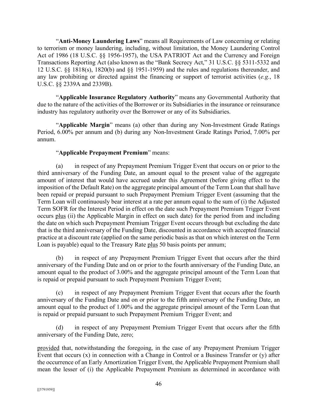 46 [[5791959]] “Anti-Money Laundering Laws” means all Requirements of Law concerning or relating to terrorism or money laundering, including, without limitation, the Money Laundering Control Act of 1986 (18 U.S.C. §§ 1956-1957), the USA PATRIOT Act and the Currency and Foreign Transactions Reporting Act (also known as the “Bank Secrecy Act,” 31 U.S.C. §§ 5311-5332 and 12 U.S.C. §§ 1818(s), 1820(b) and §§ 1951-1959) and the rules and regulations thereunder, and any law prohibiting or directed against the financing or support of terrorist activities (e.g., 18 U.S.C. §§ 2339A and 2339B). “Applicable Insurance Regulatory Authority” means any Governmental Authority that due to the nature of the activities of the Borrower or its Subsidiaries in the insurance or reinsurance industry has regulatory authority over the Borrower or any of its Subsidiaries. “Applicable Margin” means (a) other than during any Non-Investment Grade Ratings Period, 6.00% per annum and (b) during any Non-Investment Grade Ratings Period, 7.00% per annum. “Applicable Prepayment Premium” means: (a) in respect of any Prepayment Premium Trigger Event that occurs on or prior to the third anniversary of the Funding Date, an amount equal to the present value of the aggregate amount of interest that would have accrued under this Agreement (before giving effect to the imposition of the Default Rate) on the aggregate principal amount of the Term Loan that shall have been repaid or prepaid pursuant to such Prepayment Premium Trigger Event (assuming that the Term Loan will continuously bear interest at a rate per annum equal to the sum of (i) the Adjusted Term SOFR for the Interest Period in effect on the date such Prepayment Premium Trigger Event occurs plus (ii) the Applicable Margin in effect on such date) for the period from and including the date on which such Prepayment Premium Trigger Event occurs through but excluding the date that is the third anniversary of the Funding Date, discounted in accordance with accepted financial practice at a discount rate (applied on the same periodic basis as that on which interest on the Term Loan is payable) equal to the Treasury Rate plus 50 basis points per annum; (b) in respect of any Prepayment Premium Trigger Event that occurs after the third anniversary of the Funding Date and on or prior to the fourth anniversary of the Funding Date, an amount equal to the product of 3.00% and the aggregate principal amount of the Term Loan that is repaid or prepaid pursuant to such Prepayment Premium Trigger Event; (c) in respect of any Prepayment Premium Trigger Event that occurs after the fourth anniversary of the Funding Date and on or prior to the fifth anniversary of the Funding Date, an amount equal to the product of 1.00% and the aggregate principal amount of the Term Loan that is repaid or prepaid pursuant to such Prepayment Premium Trigger Event; and (d) in respect of any Prepayment Premium Trigger Event that occurs after the fifth anniversary of the Funding Date, zero; provided that, notwithstanding the foregoing, in the case of any Prepayment Premium Trigger Event that occurs (x) in connection with a Change in Control or a Business Transfer or (y) after the occurrence of an Early Amortization Trigger Event, the Applicable Prepayment Premium shall mean the lesser of (i) the Applicable Prepayment Premium as determined in accordance with