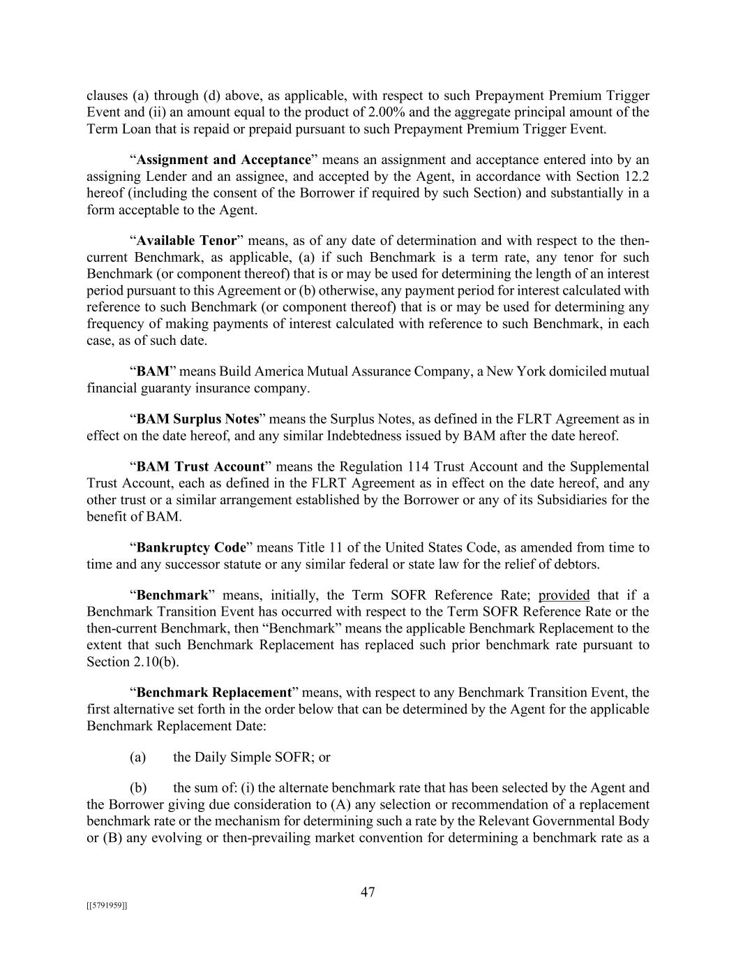47 [[5791959]] clauses (a) through (d) above, as applicable, with respect to such Prepayment Premium Trigger Event and (ii) an amount equal to the product of 2.00% and the aggregate principal amount of the Term Loan that is repaid or prepaid pursuant to such Prepayment Premium Trigger Event. “Assignment and Acceptance” means an assignment and acceptance entered into by an assigning Lender and an assignee, and accepted by the Agent, in accordance with Section 12.2 hereof (including the consent of the Borrower if required by such Section) and substantially in a form acceptable to the Agent. “Available Tenor” means, as of any date of determination and with respect to the then- current Benchmark, as applicable, (a) if such Benchmark is a term rate, any tenor for such Benchmark (or component thereof) that is or may be used for determining the length of an interest period pursuant to this Agreement or (b) otherwise, any payment period for interest calculated with reference to such Benchmark (or component thereof) that is or may be used for determining any frequency of making payments of interest calculated with reference to such Benchmark, in each case, as of such date. “BAM” means Build America Mutual Assurance Company, a New York domiciled mutual financial guaranty insurance company. “BAM Surplus Notes” means the Surplus Notes, as defined in the FLRT Agreement as in effect on the date hereof, and any similar Indebtedness issued by BAM after the date hereof. “BAM Trust Account” means the Regulation 114 Trust Account and the Supplemental Trust Account, each as defined in the FLRT Agreement as in effect on the date hereof, and any other trust or a similar arrangement established by the Borrower or any of its Subsidiaries for the benefit of BAM. “Bankruptcy Code” means Title 11 of the United States Code, as amended from time to time and any successor statute or any similar federal or state law for the relief of debtors. “Benchmark” means, initially, the Term SOFR Reference Rate; provided that if a Benchmark Transition Event has occurred with respect to the Term SOFR Reference Rate or the then-current Benchmark, then “Benchmark” means the applicable Benchmark Replacement to the extent that such Benchmark Replacement has replaced such prior benchmark rate pursuant to Section 2.10(b). “Benchmark Replacement” means, with respect to any Benchmark Transition Event, the first alternative set forth in the order below that can be determined by the Agent for the applicable Benchmark Replacement Date: (a) the Daily Simple SOFR; or (b) the sum of: (i) the alternate benchmark rate that has been selected by the Agent and the Borrower giving due consideration to (A) any selection or recommendation of a replacement benchmark rate or the mechanism for determining such a rate by the Relevant Governmental Body or (B) any evolving or then-prevailing market convention for determining a benchmark rate as a