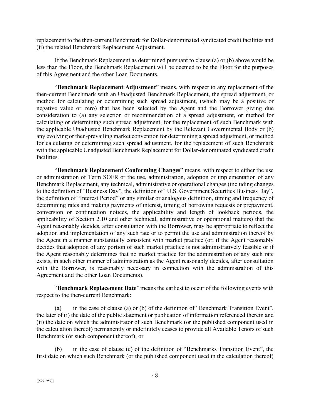 48 [[5791959]] replacement to the then-current Benchmark for Dollar-denominated syndicated credit facilities and (ii) the related Benchmark Replacement Adjustment. If the Benchmark Replacement as determined pursuant to clause (a) or (b) above would be less than the Floor, the Benchmark Replacement will be deemed to be the Floor for the purposes of this Agreement and the other Loan Documents. “Benchmark Replacement Adjustment” means, with respect to any replacement of the then-current Benchmark with an Unadjusted Benchmark Replacement, the spread adjustment, or method for calculating or determining such spread adjustment, (which may be a positive or negative value or zero) that has been selected by the Agent and the Borrower giving due consideration to (a) any selection or recommendation of a spread adjustment, or method for calculating or determining such spread adjustment, for the replacement of such Benchmark with the applicable Unadjusted Benchmark Replacement by the Relevant Governmental Body or (b) any evolving or then-prevailing market convention for determining a spread adjustment, or method for calculating or determining such spread adjustment, for the replacement of such Benchmark with the applicable Unadjusted Benchmark Replacement for Dollar-denominated syndicated credit facilities. “Benchmark Replacement Conforming Changes” means, with respect to either the use or administration of Term SOFR or the use, administration, adoption or implementation of any Benchmark Replacement, any technical, administrative or operational changes (including changes to the definition of “Business Day”, the definition of “U.S. Government Securities Business Day”, the definition of “Interest Period” or any similar or analogous definition, timing and frequency of determining rates and making payments of interest, timing of borrowing requests or prepayment, conversion or continuation notices, the applicability and length of lookback periods, the applicability of Section 2.10 and other technical, administrative or operational matters) that the Agent reasonably decides, after consultation with the Borrower, may be appropriate to reflect the adoption and implementation of any such rate or to permit the use and administration thereof by the Agent in a manner substantially consistent with market practice (or, if the Agent reasonably decides that adoption of any portion of such market practice is not administratively feasible or if the Agent reasonably determines that no market practice for the administration of any such rate exists, in such other manner of administration as the Agent reasonably decides, after consultation with the Borrower, is reasonably necessary in connection with the administration of this Agreement and the other Loan Documents). “Benchmark Replacement Date” means the earliest to occur of the following events with respect to the then-current Benchmark: (a) in the case of clause (a) or (b) of the definition of “Benchmark Transition Event”, the later of (i) the date of the public statement or publication of information referenced therein and (ii) the date on which the administrator of such Benchmark (or the published component used in the calculation thereof) permanently or indefinitely ceases to provide all Available Tenors of such Benchmark (or such component thereof); or (b) in the case of clause (c) of the definition of “Benchmarks Transition Event”, the first date on which such Benchmark (or the published component used in the calculation thereof)