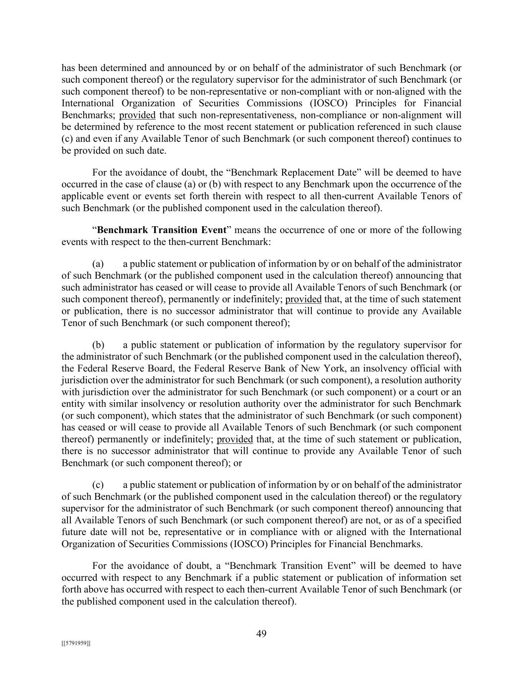 49 [[5791959]] has been determined and announced by or on behalf of the administrator of such Benchmark (or such component thereof) or the regulatory supervisor for the administrator of such Benchmark (or such component thereof) to be non-representative or non-compliant with or non-aligned with the International Organization of Securities Commissions (IOSCO) Principles for Financial Benchmarks; provided that such non-representativeness, non-compliance or non-alignment will be determined by reference to the most recent statement or publication referenced in such clause (c) and even if any Available Tenor of such Benchmark (or such component thereof) continues to be provided on such date. For the avoidance of doubt, the “Benchmark Replacement Date” will be deemed to have occurred in the case of clause (a) or (b) with respect to any Benchmark upon the occurrence of the applicable event or events set forth therein with respect to all then-current Available Tenors of such Benchmark (or the published component used in the calculation thereof). “Benchmark Transition Event” means the occurrence of one or more of the following events with respect to the then-current Benchmark: (a) a public statement or publication of information by or on behalf of the administrator of such Benchmark (or the published component used in the calculation thereof) announcing that such administrator has ceased or will cease to provide all Available Tenors of such Benchmark (or such component thereof), permanently or indefinitely; provided that, at the time of such statement or publication, there is no successor administrator that will continue to provide any Available Tenor of such Benchmark (or such component thereof); (b) a public statement or publication of information by the regulatory supervisor for the administrator of such Benchmark (or the published component used in the calculation thereof), the Federal Reserve Board, the Federal Reserve Bank of New York, an insolvency official with jurisdiction over the administrator for such Benchmark (or such component), a resolution authority with jurisdiction over the administrator for such Benchmark (or such component) or a court or an entity with similar insolvency or resolution authority over the administrator for such Benchmark (or such component), which states that the administrator of such Benchmark (or such component) has ceased or will cease to provide all Available Tenors of such Benchmark (or such component thereof) permanently or indefinitely; provided that, at the time of such statement or publication, there is no successor administrator that will continue to provide any Available Tenor of such Benchmark (or such component thereof); or (c) a public statement or publication of information by or on behalf of the administrator of such Benchmark (or the published component used in the calculation thereof) or the regulatory supervisor for the administrator of such Benchmark (or such component thereof) announcing that all Available Tenors of such Benchmark (or such component thereof) are not, or as of a specified future date will not be, representative or in compliance with or aligned with the International Organization of Securities Commissions (IOSCO) Principles for Financial Benchmarks. For the avoidance of doubt, a “Benchmark Transition Event” will be deemed to have occurred with respect to any Benchmark if a public statement or publication of information set forth above has occurred with respect to each then-current Available Tenor of such Benchmark (or the published component used in the calculation thereof).
