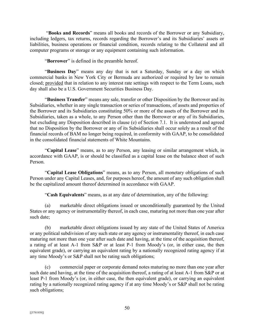 50 [[5791959]] “Books and Records” means all books and records of the Borrower or any Subsidiary, including ledgers, tax returns, records regarding the Borrower’s and its Subsidiaries’ assets or liabilities, business operations or financial condition, records relating to the Collateral and all computer programs or storage or any equipment containing such information. “Borrower” is defined in the preamble hereof. “Business Day” means any day that is not a Saturday, Sunday or a day on which commercial banks in New York City or Bermuda are authorized or required by law to remain closed; provided that in relation to any interest rate settings with respect to the Term Loans, such day shall also be a U.S. Government Securities Business Day. “Business Transfer” means any sale, transfer or other Disposition by the Borrower and its Subsidiaries, whether in any single transaction or series of transactions, of assets and properties of the Borrower and its Subsidiaries constituting 50% or more of the assets of the Borrower and its Subsidiaries, taken as a whole, to any Person other than the Borrower or any of its Subsidiaries, but excluding any Disposition described in clause (e) of Section 7.1. It is understood and agreed that no Disposition by the Borrower or any of its Subsidiaries shall occur solely as a result of the financial records of BAM no longer being required, in conformity with GAAP, to be consolidated in the consolidated financial statements of White Mountains. “Capital Lease” means, as to any Person, any leasing or similar arrangement which, in accordance with GAAP, is or should be classified as a capital lease on the balance sheet of such Person. “Capital Lease Obligations” means, as to any Person, all monetary obligations of such Person under any Capital Leases, and, for purposes hereof, the amount of any such obligation shall be the capitalized amount thereof determined in accordance with GAAP. “Cash Equivalents” means, as at any date of determination, any of the following: (a) marketable direct obligations issued or unconditionally guaranteed by the United States or any agency or instrumentality thereof, in each case, maturing not more than one year after such date; (b) marketable direct obligations issued by any state of the United States of America or any political subdivision of any such state or any agency or instrumentality thereof, in each case maturing not more than one year after such date and having, at the time of the acquisition thereof, a rating of at least A-1 from S&P or at least P-1 from Moody’s (or, in either case, the then equivalent grade), or carrying an equivalent rating by a nationally recognized rating agency if at any time Moody’s or S&P shall not be rating such obligations; (c) commercial paper or corporate demand notes maturing no more than one year after such date and having, at the time of the acquisition thereof, a rating of at least A-1 from S&P or at least P-1 from Moody’s (or, in either case, the then equivalent grade), or carrying an equivalent rating by a nationally recognized rating agency if at any time Moody’s or S&P shall not be rating such obligations;