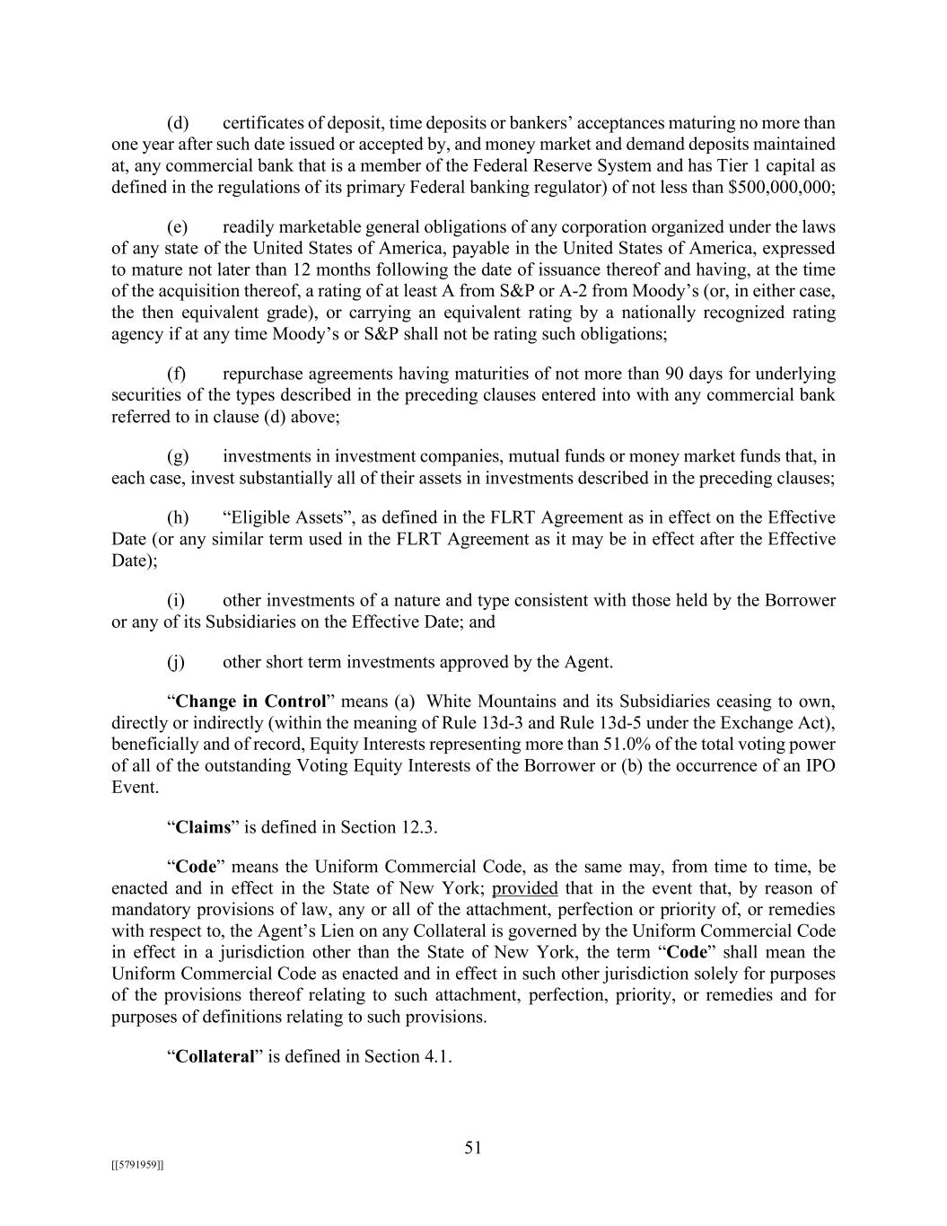 51 [[5791959]] (d) certificates of deposit, time deposits or bankers’ acceptances maturing no more than one year after such date issued or accepted by, and money market and demand deposits maintained at, any commercial bank that is a member of the Federal Reserve System and has Tier 1 capital as defined in the regulations of its primary Federal banking regulator) of not less than $500,000,000; (e) readily marketable general obligations of any corporation organized under the laws of any state of the United States of America, payable in the United States of America, expressed to mature not later than 12 months following the date of issuance thereof and having, at the time of the acquisition thereof, a rating of at least A from S&P or A-2 from Moody’s (or, in either case, the then equivalent grade), or carrying an equivalent rating by a nationally recognized rating agency if at any time Moody’s or S&P shall not be rating such obligations; (f) repurchase agreements having maturities of not more than 90 days for underlying securities of the types described in the preceding clauses entered into with any commercial bank referred to in clause (d) above; (g) investments in investment companies, mutual funds or money market funds that, in each case, invest substantially all of their assets in investments described in the preceding clauses; (h) “Eligible Assets”, as defined in the FLRT Agreement as in effect on the Effective Date (or any similar term used in the FLRT Agreement as it may be in effect after the Effective Date); (i) other investments of a nature and type consistent with those held by the Borrower or any of its Subsidiaries on the Effective Date; and (j) other short term investments approved by the Agent. “Change in Control” means (a) White Mountains and its Subsidiaries ceasing to own, directly or indirectly (within the meaning of Rule 13d-3 and Rule 13d-5 under the Exchange Act), beneficially and of record, Equity Interests representing more than 51.0% of the total voting power of all of the outstanding Voting Equity Interests of the Borrower or (b) the occurrence of an IPO Event. “Claims” is defined in Section 12.3. “Code” means the Uniform Commercial Code, as the same may, from time to time, be enacted and in effect in the State of New York; provided that in the event that, by reason of mandatory provisions of law, any or all of the attachment, perfection or priority of, or remedies with respect to, the Agent’s Lien on any Collateral is governed by the Uniform Commercial Code in effect in a jurisdiction other than the State of New York, the term “Code” shall mean the Uniform Commercial Code as enacted and in effect in such other jurisdiction solely for purposes of the provisions thereof relating to such attachment, perfection, priority, or remedies and for purposes of definitions relating to such provisions. “Collateral” is defined in Section 4.1.