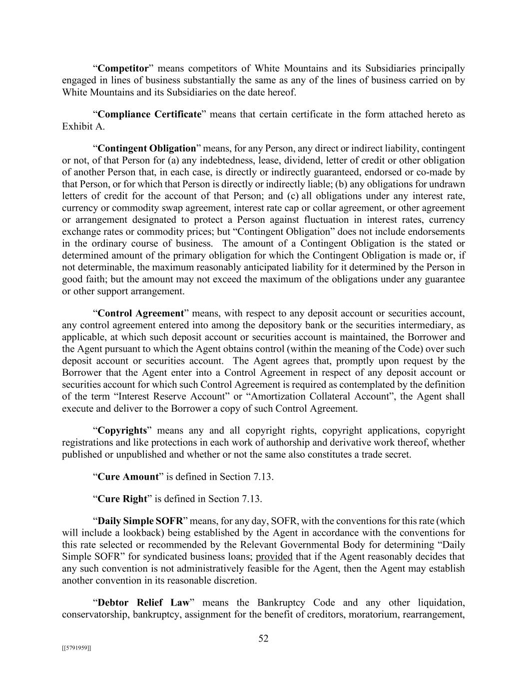 52 [[5791959]] “Competitor” means competitors of White Mountains and its Subsidiaries principally engaged in lines of business substantially the same as any of the lines of business carried on by White Mountains and its Subsidiaries on the date hereof. “Compliance Certificate” means that certain certificate in the form attached hereto as Exhibit A. “Contingent Obligation” means, for any Person, any direct or indirect liability, contingent or not, of that Person for (a) any indebtedness, lease, dividend, letter of credit or other obligation of another Person that, in each case, is directly or indirectly guaranteed, endorsed or co-made by that Person, or for which that Person is directly or indirectly liable; (b) any obligations for undrawn letters of credit for the account of that Person; and (c) all obligations under any interest rate, currency or commodity swap agreement, interest rate cap or collar agreement, or other agreement or arrangement designated to protect a Person against fluctuation in interest rates, currency exchange rates or commodity prices; but “Contingent Obligation” does not include endorsements in the ordinary course of business. The amount of a Contingent Obligation is the stated or determined amount of the primary obligation for which the Contingent Obligation is made or, if not determinable, the maximum reasonably anticipated liability for it determined by the Person in good faith; but the amount may not exceed the maximum of the obligations under any guarantee or other support arrangement. “Control Agreement” means, with respect to any deposit account or securities account, any control agreement entered into among the depository bank or the securities intermediary, as applicable, at which such deposit account or securities account is maintained, the Borrower and the Agent pursuant to which the Agent obtains control (within the meaning of the Code) over such deposit account or securities account. The Agent agrees that, promptly upon request by the Borrower that the Agent enter into a Control Agreement in respect of any deposit account or securities account for which such Control Agreement is required as contemplated by the definition of the term “Interest Reserve Account” or “Amortization Collateral Account”, the Agent shall execute and deliver to the Borrower a copy of such Control Agreement. “Copyrights” means any and all copyright rights, copyright applications, copyright registrations and like protections in each work of authorship and derivative work thereof, whether published or unpublished and whether or not the same also constitutes a trade secret. “Cure Amount” is defined in Section 7.13. “Cure Right” is defined in Section 7.13. “Daily Simple SOFR” means, for any day, SOFR, with the conventions for this rate (which will include a lookback) being established by the Agent in accordance with the conventions for this rate selected or recommended by the Relevant Governmental Body for determining “Daily Simple SOFR” for syndicated business loans; provided that if the Agent reasonably decides that any such convention is not administratively feasible for the Agent, then the Agent may establish another convention in its reasonable discretion. “Debtor Relief Law” means the Bankruptcy Code and any other liquidation, conservatorship, bankruptcy, assignment for the benefit of creditors, moratorium, rearrangement,