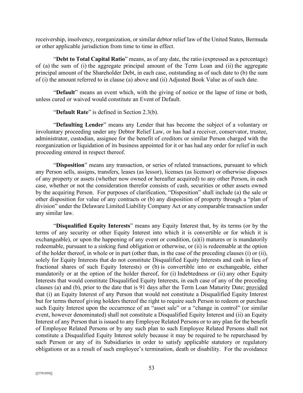 53 [[5791959]] receivership, insolvency, reorganization, or similar debtor relief law of the United States, Bermuda or other applicable jurisdiction from time to time in effect. “Debt to Total Capital Ratio” means, as of any date, the ratio (expressed as a percentage) of (a) the sum of (i) the aggregate principal amount of the Term Loan and (ii) the aggregate principal amount of the Shareholder Debt, in each case, outstanding as of such date to (b) the sum of (i) the amount referred to in clause (a) above and (ii) Adjusted Book Value as of such date. “Default” means an event which, with the giving of notice or the lapse of time or both, unless cured or waived would constitute an Event of Default. “Default Rate” is defined in Section 2.3(b). “Defaulting Lender” means any Lender that has become the subject of a voluntary or involuntary proceeding under any Debtor Relief Law, or has had a receiver, conservator, trustee, administrator, custodian, assignee for the benefit of creditors or similar Person charged with the reorganization or liquidation of its business appointed for it or has had any order for relief in such proceeding entered in respect thereof. “Disposition” means any transaction, or series of related transactions, pursuant to which any Person sells, assigns, transfers, leases (as lessor), licenses (as licensor) or otherwise disposes of any property or assets (whether now owned or hereafter acquired) to any other Person, in each case, whether or not the consideration therefor consists of cash, securities or other assets owned by the acquiring Person. For purposes of clarification, “Disposition” shall include (a) the sale or other disposition for value of any contracts or (b) any disposition of property through a “plan of division” under the Delaware Limited Liability Company Act or any comparable transaction under any similar law. “Disqualified Equity Interests” means any Equity Interest that, by its terms (or by the terms of any security or other Equity Interest into which it is convertible or for which it is exchangeable), or upon the happening of any event or condition, (a)(i) matures or is mandatorily redeemable, pursuant to a sinking fund obligation or otherwise, or (ii) is redeemable at the option of the holder thereof, in whole or in part (other than, in the case of the preceding clauses (i) or (ii), solely for Equity Interests that do not constitute Disqualified Equity Interests and cash in lieu of fractional shares of such Equity Interests) or (b) is convertible into or exchangeable, either mandatorily or at the option of the holder thereof, for (i) Indebtedness or (ii) any other Equity Interests that would constitute Disqualified Equity Interests, in each case of any of the preceding clauses (a) and (b), prior to the date that is 91 days after the Term Loan Maturity Date; provided that (i) an Equity Interest of any Person that would not constitute a Disqualified Equity Interest but for terms thereof giving holders thereof the right to require such Person to redeem or purchase such Equity Interest upon the occurrence of an “asset sale” or a “change in control” (or similar event, however denominated) shall not constitute a Disqualified Equity Interest and (ii) an Equity Interest of any Person that is issued to any Employee Related Persons or to any plan for the benefit of Employee Related Persons or by any such plan to such Employee Related Persons shall not constitute a Disqualified Equity Interest solely because it may be required to be repurchased by such Person or any of its Subsidiaries in order to satisfy applicable statutory or regulatory obligations or as a result of such employee’s termination, death or disability. For the avoidance