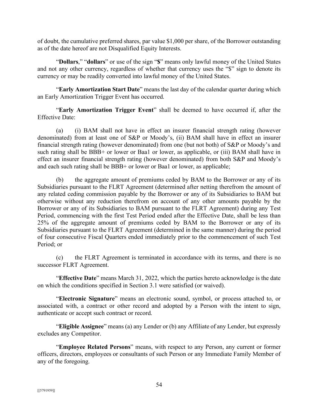 54 [[5791959]] of doubt, the cumulative preferred shares, par value $1,000 per share, of the Borrower outstanding as of the date hereof are not Disqualified Equity Interests. “Dollars,” “dollars” or use of the sign “$” means only lawful money of the United States and not any other currency, regardless of whether that currency uses the “$” sign to denote its currency or may be readily converted into lawful money of the United States. “Early Amortization Start Date” means the last day of the calendar quarter during which an Early Amortization Trigger Event has occurred. “Early Amortization Trigger Event” shall be deemed to have occurred if, after the Effective Date: (a) (i) BAM shall not have in effect an insurer financial strength rating (however denominated) from at least one of S&P or Moody’s, (ii) BAM shall have in effect an insurer financial strength rating (however denominated) from one (but not both) of S&P or Moody’s and such rating shall be BBB+ or lower or Baa1 or lower, as applicable, or (iii) BAM shall have in effect an insurer financial strength rating (however denominated) from both S&P and Moody’s and each such rating shall be BBB+ or lower or Baa1 or lower, as applicable; (b) the aggregate amount of premiums ceded by BAM to the Borrower or any of its Subsidiaries pursuant to the FLRT Agreement (determined after netting therefrom the amount of any related ceding commission payable by the Borrower or any of its Subsidiaries to BAM but otherwise without any reduction therefrom on account of any other amounts payable by the Borrower or any of its Subsidiaries to BAM pursuant to the FLRT Agreement) during any Test Period, commencing with the first Test Period ended after the Effective Date, shall be less than 25% of the aggregate amount of premiums ceded by BAM to the Borrower or any of its Subsidiaries pursuant to the FLRT Agreement (determined in the same manner) during the period of four consecutive Fiscal Quarters ended immediately prior to the commencement of such Test Period; or (c) the FLRT Agreement is terminated in accordance with its terms, and there is no successor FLRT Agreement. “Effective Date” means March 31, 2022, which the parties hereto acknowledge is the date on which the conditions specified in Section 3.1 were satisfied (or waived). “Electronic Signature” means an electronic sound, symbol, or process attached to, or associated with, a contract or other record and adopted by a Person with the intent to sign, authenticate or accept such contract or record. “Eligible Assignee” means (a) any Lender or (b) any Affiliate of any Lender, but expressly excludes any Competitor. “Employee Related Persons” means, with respect to any Person, any current or former officers, directors, employees or consultants of such Person or any Immediate Family Member of any of the foregoing.