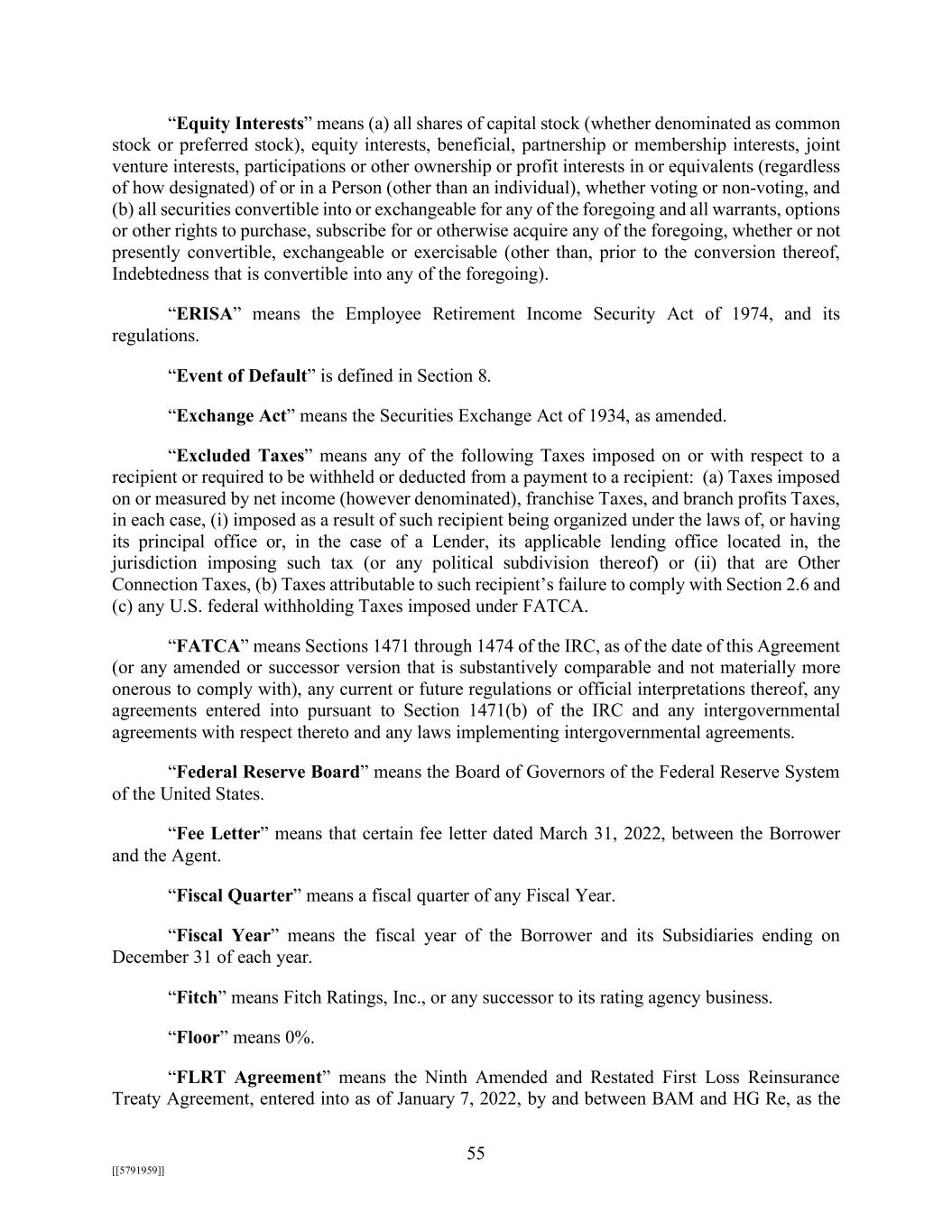55 [[5791959]] “Equity Interests” means (a) all shares of capital stock (whether denominated as common stock or preferred stock), equity interests, beneficial, partnership or membership interests, joint venture interests, participations or other ownership or profit interests in or equivalents (regardless of how designated) of or in a Person (other than an individual), whether voting or non-voting, and (b) all securities convertible into or exchangeable for any of the foregoing and all warrants, options or other rights to purchase, subscribe for or otherwise acquire any of the foregoing, whether or not presently convertible, exchangeable or exercisable (other than, prior to the conversion thereof, Indebtedness that is convertible into any of the foregoing). “ERISA” means the Employee Retirement Income Security Act of 1974, and its regulations. “Event of Default” is defined in Section 8. “Exchange Act” means the Securities Exchange Act of 1934, as amended. “Excluded Taxes” means any of the following Taxes imposed on or with respect to a recipient or required to be withheld or deducted from a payment to a recipient: (a) Taxes imposed on or measured by net income (however denominated), franchise Taxes, and branch profits Taxes, in each case, (i) imposed as a result of such recipient being organized under the laws of, or having its principal office or, in the case of a Lender, its applicable lending office located in, the jurisdiction imposing such tax (or any political subdivision thereof) or (ii) that are Other Connection Taxes, (b) Taxes attributable to such recipient’s failure to comply with Section 2.6 and (c) any U.S. federal withholding Taxes imposed under FATCA. “FATCA” means Sections 1471 through 1474 of the IRC, as of the date of this Agreement (or any amended or successor version that is substantively comparable and not materially more onerous to comply with), any current or future regulations or official interpretations thereof, any agreements entered into pursuant to Section 1471(b) of the IRC and any intergovernmental agreements with respect thereto and any laws implementing intergovernmental agreements. “Federal Reserve Board” means the Board of Governors of the Federal Reserve System of the United States. “Fee Letter” means that certain fee letter dated March 31, 2022, between the Borrower and the Agent. “Fiscal Quarter” means a fiscal quarter of any Fiscal Year. “Fiscal Year” means the fiscal year of the Borrower and its Subsidiaries ending on December 31 of each year. “Fitch” means Fitch Ratings, Inc., or any successor to its rating agency business. “Floor” means 0%. “FLRT Agreement” means the Ninth Amended and Restated First Loss Reinsurance Treaty Agreement, entered into as of January 7, 2022, by and between BAM and HG Re, as the