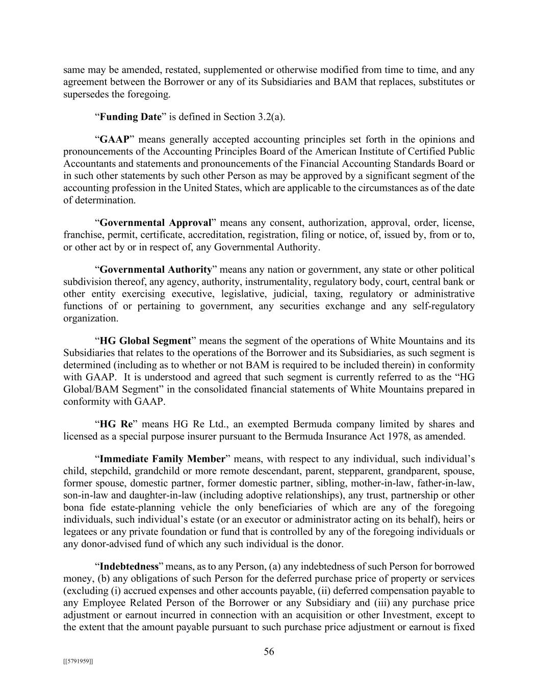 56 [[5791959]] same may be amended, restated, supplemented or otherwise modified from time to time, and any agreement between the Borrower or any of its Subsidiaries and BAM that replaces, substitutes or supersedes the foregoing. “Funding Date” is defined in Section 3.2(a). “GAAP” means generally accepted accounting principles set forth in the opinions and pronouncements of the Accounting Principles Board of the American Institute of Certified Public Accountants and statements and pronouncements of the Financial Accounting Standards Board or in such other statements by such other Person as may be approved by a significant segment of the accounting profession in the United States, which are applicable to the circumstances as of the date of determination. “Governmental Approval” means any consent, authorization, approval, order, license, franchise, permit, certificate, accreditation, registration, filing or notice, of, issued by, from or to, or other act by or in respect of, any Governmental Authority. “Governmental Authority” means any nation or government, any state or other political subdivision thereof, any agency, authority, instrumentality, regulatory body, court, central bank or other entity exercising executive, legislative, judicial, taxing, regulatory or administrative functions of or pertaining to government, any securities exchange and any self-regulatory organization. “HG Global Segment” means the segment of the operations of White Mountains and its Subsidiaries that relates to the operations of the Borrower and its Subsidiaries, as such segment is determined (including as to whether or not BAM is required to be included therein) in conformity with GAAP. It is understood and agreed that such segment is currently referred to as the “HG Global/BAM Segment” in the consolidated financial statements of White Mountains prepared in conformity with GAAP. “HG Re” means HG Re Ltd., an exempted Bermuda company limited by shares and licensed as a special purpose insurer pursuant to the Bermuda Insurance Act 1978, as amended. “Immediate Family Member” means, with respect to any individual, such individual’s child, stepchild, grandchild or more remote descendant, parent, stepparent, grandparent, spouse, former spouse, domestic partner, former domestic partner, sibling, mother-in-law, father-in-law, son-in-law and daughter-in-law (including adoptive relationships), any trust, partnership or other bona fide estate-planning vehicle the only beneficiaries of which are any of the foregoing individuals, such individual’s estate (or an executor or administrator acting on its behalf), heirs or legatees or any private foundation or fund that is controlled by any of the foregoing individuals or any donor-advised fund of which any such individual is the donor. “Indebtedness” means, as to any Person, (a) any indebtedness of such Person for borrowed money, (b) any obligations of such Person for the deferred purchase price of property or services (excluding (i) accrued expenses and other accounts payable, (ii) deferred compensation payable to any Employee Related Person of the Borrower or any Subsidiary and (iii) any purchase price adjustment or earnout incurred in connection with an acquisition or other Investment, except to the extent that the amount payable pursuant to such purchase price adjustment or earnout is fixed