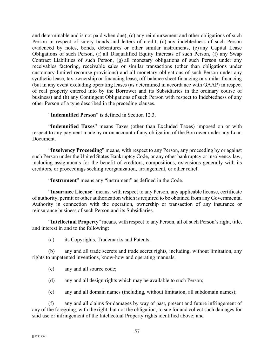 57 [[5791959]] and determinable and is not paid when due), (c) any reimbursement and other obligations of such Person in respect of surety bonds and letters of credit, (d) any indebtedness of such Person evidenced by notes, bonds, debentures or other similar instruments, (e) any Capital Lease Obligations of such Person, (f) all Disqualified Equity Interests of such Person, (f) any Swap Contract Liabilities of such Person, (g) all monetary obligations of such Person under any receivables factoring, receivable sales or similar transactions (other than obligations under customary limited recourse provisions) and all monetary obligations of such Person under any synthetic lease, tax ownership or financing lease, off-balance sheet financing or similar financing (but in any event excluding operating leases (as determined in accordance with GAAP) in respect of real property entered into by the Borrower and its Subsidiaries in the ordinary course of business) and (h) any Contingent Obligations of such Person with respect to Indebtedness of any other Person of a type described in the preceding clauses. “Indemnified Person” is defined in Section 12.3. “Indemnified Taxes” means Taxes (other than Excluded Taxes) imposed on or with respect to any payment made by or on account of any obligation of the Borrower under any Loan Document. “Insolvency Proceeding” means, with respect to any Person, any proceeding by or against such Person under the United States Bankruptcy Code, or any other bankruptcy or insolvency law, including assignments for the benefit of creditors, compositions, extensions generally with its creditors, or proceedings seeking reorganization, arrangement, or other relief. “Instrument” means any “instrument” as defined in the Code. “Insurance License” means, with respect to any Person, any applicable license, certificate of authority, permit or other authorization which is required to be obtained from any Governmental Authority in connection with the operation, ownership or transaction of any insurance or reinsurance business of such Person and its Subsidiaries. “Intellectual Property” means, with respect to any Person, all of such Person’s right, title, and interest in and to the following: (a) its Copyrights, Trademarks and Patents; (b) any and all trade secrets and trade secret rights, including, without limitation, any rights to unpatented inventions, know-how and operating manuals; (c) any and all source code; (d) any and all design rights which may be available to such Person; (e) any and all domain names (including, without limitation, all subdomain names); (f) any and all claims for damages by way of past, present and future infringement of any of the foregoing, with the right, but not the obligation, to sue for and collect such damages for said use or infringement of the Intellectual Property rights identified above; and