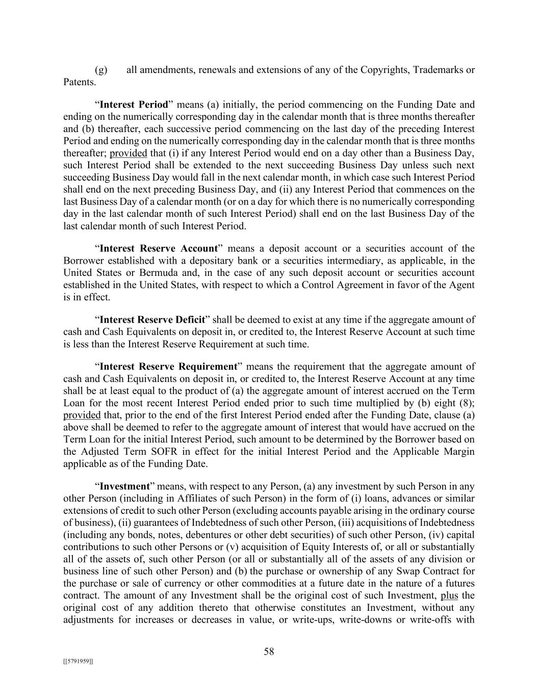 58 [[5791959]] (g) all amendments, renewals and extensions of any of the Copyrights, Trademarks or Patents. “Interest Period” means (a) initially, the period commencing on the Funding Date and ending on the numerically corresponding day in the calendar month that is three months thereafter and (b) thereafter, each successive period commencing on the last day of the preceding Interest Period and ending on the numerically corresponding day in the calendar month that is three months thereafter; provided that (i) if any Interest Period would end on a day other than a Business Day, such Interest Period shall be extended to the next succeeding Business Day unless such next succeeding Business Day would fall in the next calendar month, in which case such Interest Period shall end on the next preceding Business Day, and (ii) any Interest Period that commences on the last Business Day of a calendar month (or on a day for which there is no numerically corresponding day in the last calendar month of such Interest Period) shall end on the last Business Day of the last calendar month of such Interest Period. “Interest Reserve Account” means a deposit account or a securities account of the Borrower established with a depositary bank or a securities intermediary, as applicable, in the United States or Bermuda and, in the case of any such deposit account or securities account established in the United States, with respect to which a Control Agreement in favor of the Agent is in effect. “Interest Reserve Deficit” shall be deemed to exist at any time if the aggregate amount of cash and Cash Equivalents on deposit in, or credited to, the Interest Reserve Account at such time is less than the Interest Reserve Requirement at such time. “Interest Reserve Requirement” means the requirement that the aggregate amount of cash and Cash Equivalents on deposit in, or credited to, the Interest Reserve Account at any time shall be at least equal to the product of (a) the aggregate amount of interest accrued on the Term Loan for the most recent Interest Period ended prior to such time multiplied by (b) eight (8); provided that, prior to the end of the first Interest Period ended after the Funding Date, clause (a) above shall be deemed to refer to the aggregate amount of interest that would have accrued on the Term Loan for the initial Interest Period, such amount to be determined by the Borrower based on the Adjusted Term SOFR in effect for the initial Interest Period and the Applicable Margin applicable as of the Funding Date. “Investment” means, with respect to any Person, (a) any investment by such Person in any other Person (including in Affiliates of such Person) in the form of (i) loans, advances or similar extensions of credit to such other Person (excluding accounts payable arising in the ordinary course of business), (ii) guarantees of Indebtedness of such other Person, (iii) acquisitions of Indebtedness (including any bonds, notes, debentures or other debt securities) of such other Person, (iv) capital contributions to such other Persons or (v) acquisition of Equity Interests of, or all or substantially all of the assets of, such other Person (or all or substantially all of the assets of any division or business line of such other Person) and (b) the purchase or ownership of any Swap Contract for the purchase or sale of currency or other commodities at a future date in the nature of a futures contract. The amount of any Investment shall be the original cost of such Investment, plus the original cost of any addition thereto that otherwise constitutes an Investment, without any adjustments for increases or decreases in value, or write-ups, write-downs or write-offs with