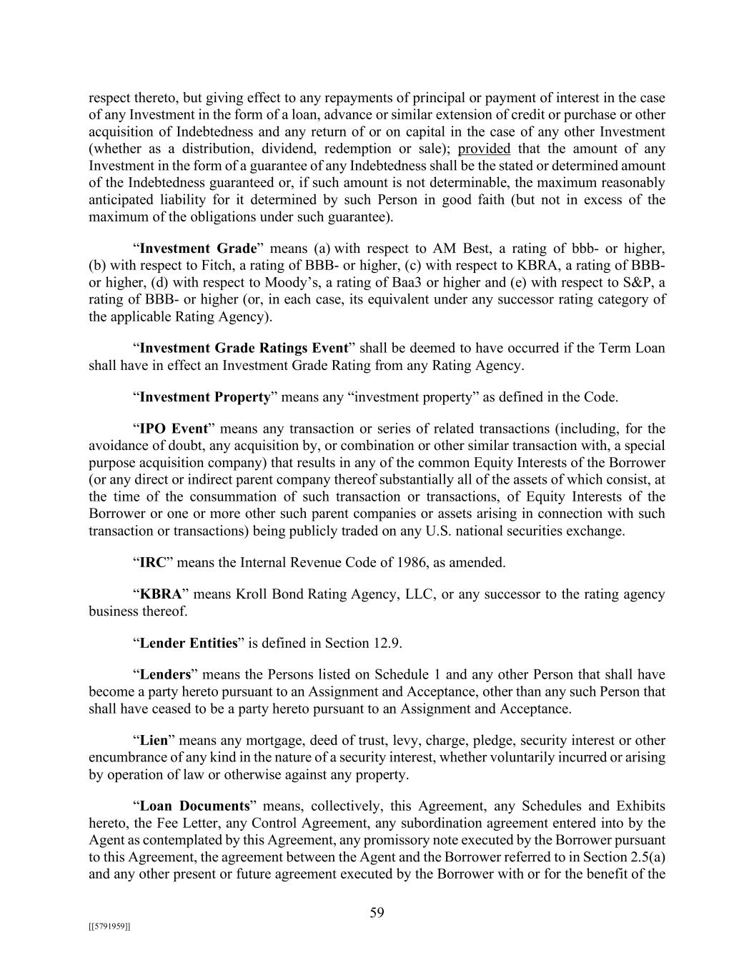 59 [[5791959]] respect thereto, but giving effect to any repayments of principal or payment of interest in the case of any Investment in the form of a loan, advance or similar extension of credit or purchase or other acquisition of Indebtedness and any return of or on capital in the case of any other Investment (whether as a distribution, dividend, redemption or sale); provided that the amount of any Investment in the form of a guarantee of any Indebtedness shall be the stated or determined amount of the Indebtedness guaranteed or, if such amount is not determinable, the maximum reasonably anticipated liability for it determined by such Person in good faith (but not in excess of the maximum of the obligations under such guarantee). “Investment Grade” means (a) with respect to AM Best, a rating of bbb- or higher, (b) with respect to Fitch, a rating of BBB- or higher, (c) with respect to KBRA, a rating of BBB- or higher, (d) with respect to Moody’s, a rating of Baa3 or higher and (e) with respect to S&P, a rating of BBB- or higher (or, in each case, its equivalent under any successor rating category of the applicable Rating Agency). “Investment Grade Ratings Event” shall be deemed to have occurred if the Term Loan shall have in effect an Investment Grade Rating from any Rating Agency. “Investment Property” means any “investment property” as defined in the Code. “IPO Event” means any transaction or series of related transactions (including, for the avoidance of doubt, any acquisition by, or combination or other similar transaction with, a special purpose acquisition company) that results in any of the common Equity Interests of the Borrower (or any direct or indirect parent company thereof substantially all of the assets of which consist, at the time of the consummation of such transaction or transactions, of Equity Interests of the Borrower or one or more other such parent companies or assets arising in connection with such transaction or transactions) being publicly traded on any U.S. national securities exchange. “IRC” means the Internal Revenue Code of 1986, as amended. “KBRA” means Kroll Bond Rating Agency, LLC, or any successor to the rating agency business thereof. “Lender Entities” is defined in Section 12.9. “Lenders” means the Persons listed on Schedule 1 and any other Person that shall have become a party hereto pursuant to an Assignment and Acceptance, other than any such Person that shall have ceased to be a party hereto pursuant to an Assignment and Acceptance. “Lien” means any mortgage, deed of trust, levy, charge, pledge, security interest or other encumbrance of any kind in the nature of a security interest, whether voluntarily incurred or arising by operation of law or otherwise against any property. “Loan Documents” means, collectively, this Agreement, any Schedules and Exhibits hereto, the Fee Letter, any Control Agreement, any subordination agreement entered into by the Agent as contemplated by this Agreement, any promissory note executed by the Borrower pursuant to this Agreement, the agreement between the Agent and the Borrower referred to in Section 2.5(a) and any other present or future agreement executed by the Borrower with or for the benefit of the