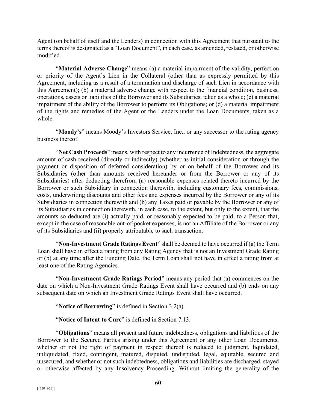 60 [[5791959]] Agent (on behalf of itself and the Lenders) in connection with this Agreement that pursuant to the terms thereof is designated as a “Loan Document”, in each case, as amended, restated, or otherwise modified. “Material Adverse Change” means (a) a material impairment of the validity, perfection or priority of the Agent’s Lien in the Collateral (other than as expressly permitted by this Agreement, including as a result of a termination and discharge of such Lien in accordance with this Agreement); (b) a material adverse change with respect to the financial condition, business, operations, assets or liabilities of the Borrower and its Subsidiaries, taken as a whole; (c) a material impairment of the ability of the Borrower to perform its Obligations; or (d) a material impairment of the rights and remedies of the Agent or the Lenders under the Loan Documents, taken as a whole. “Moody’s” means Moody’s Investors Service, Inc., or any successor to the rating agency business thereof. “Net Cash Proceeds” means, with respect to any incurrence of Indebtedness, the aggregate amount of cash received (directly or indirectly) (whether as initial consideration or through the payment or disposition of deferred consideration) by or on behalf of the Borrower and its Subsidiaries (other than amounts received hereunder or from the Borrower or any of its Subsidiaries) after deducting therefrom (a) reasonable expenses related thereto incurred by the Borrower or such Subsidiary in connection therewith, including customary fees, commissions, costs, underwriting discounts and other fees and expenses incurred by the Borrower or any of its Subsidiaries in connection therewith and (b) any Taxes paid or payable by the Borrower or any of its Subsidiaries in connection therewith, in each case, to the extent, but only to the extent, that the amounts so deducted are (i) actually paid, or reasonably expected to be paid, to a Person that, except in the case of reasonable out-of-pocket expenses, is not an Affiliate of the Borrower or any of its Subsidiaries and (ii) properly attributable to such transaction. “Non-Investment Grade Ratings Event” shall be deemed to have occurred if (a) the Term Loan shall have in effect a rating from any Rating Agency that is not an Investment Grade Rating or (b) at any time after the Funding Date, the Term Loan shall not have in effect a rating from at least one of the Rating Agencies. “Non-Investment Grade Ratings Period” means any period that (a) commences on the date on which a Non-Investment Grade Ratings Event shall have occurred and (b) ends on any subsequent date on which an Investment Grade Ratings Event shall have occurred. “Notice of Borrowing” is defined in Section 3.2(a). “Notice of Intent to Cure” is defined in Section 7.13. “Obligations” means all present and future indebtedness, obligations and liabilities of the Borrower to the Secured Parties arising under this Agreement or any other Loan Documents, whether or not the right of payment in respect thereof is reduced to judgment, liquidated, unliquidated, fixed, contingent, matured, disputed, undisputed, legal, equitable, secured and unsecured, and whether or not such indebtedness, obligations and liabilities are discharged, stayed or otherwise affected by any Insolvency Proceeding. Without limiting the generality of the
