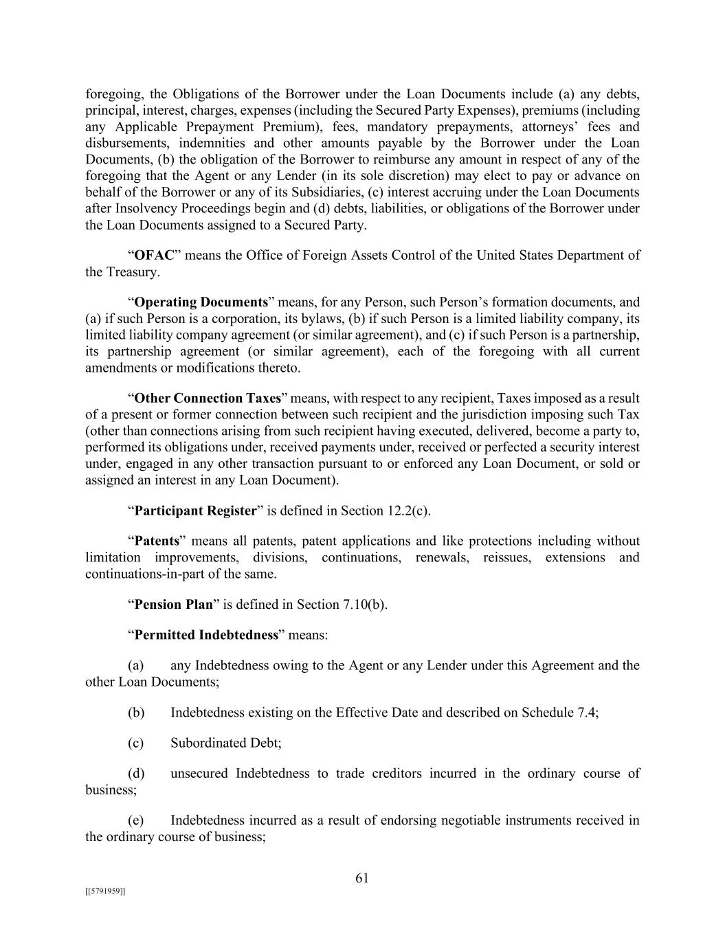61 [[5791959]] foregoing, the Obligations of the Borrower under the Loan Documents include (a) any debts, principal, interest, charges, expenses (including the Secured Party Expenses), premiums (including any Applicable Prepayment Premium), fees, mandatory prepayments, attorneys’ fees and disbursements, indemnities and other amounts payable by the Borrower under the Loan Documents, (b) the obligation of the Borrower to reimburse any amount in respect of any of the foregoing that the Agent or any Lender (in its sole discretion) may elect to pay or advance on behalf of the Borrower or any of its Subsidiaries, (c) interest accruing under the Loan Documents after Insolvency Proceedings begin and (d) debts, liabilities, or obligations of the Borrower under the Loan Documents assigned to a Secured Party. “OFAC” means the Office of Foreign Assets Control of the United States Department of the Treasury. “Operating Documents” means, for any Person, such Person’s formation documents, and (a) if such Person is a corporation, its bylaws, (b) if such Person is a limited liability company, its limited liability company agreement (or similar agreement), and (c) if such Person is a partnership, its partnership agreement (or similar agreement), each of the foregoing with all current amendments or modifications thereto. “Other Connection Taxes” means, with respect to any recipient, Taxes imposed as a result of a present or former connection between such recipient and the jurisdiction imposing such Tax (other than connections arising from such recipient having executed, delivered, become a party to, performed its obligations under, received payments under, received or perfected a security interest under, engaged in any other transaction pursuant to or enforced any Loan Document, or sold or assigned an interest in any Loan Document). “Participant Register” is defined in Section 12.2(c). “Patents” means all patents, patent applications and like protections including without limitation improvements, divisions, continuations, renewals, reissues, extensions and continuations-in-part of the same. “Pension Plan” is defined in Section 7.10(b). “Permitted Indebtedness” means: (a) any Indebtedness owing to the Agent or any Lender under this Agreement and the other Loan Documents; (b) Indebtedness existing on the Effective Date and described on Schedule 7.4; (c) Subordinated Debt; (d) unsecured Indebtedness to trade creditors incurred in the ordinary course of business; (e) Indebtedness incurred as a result of endorsing negotiable instruments received in the ordinary course of business;
