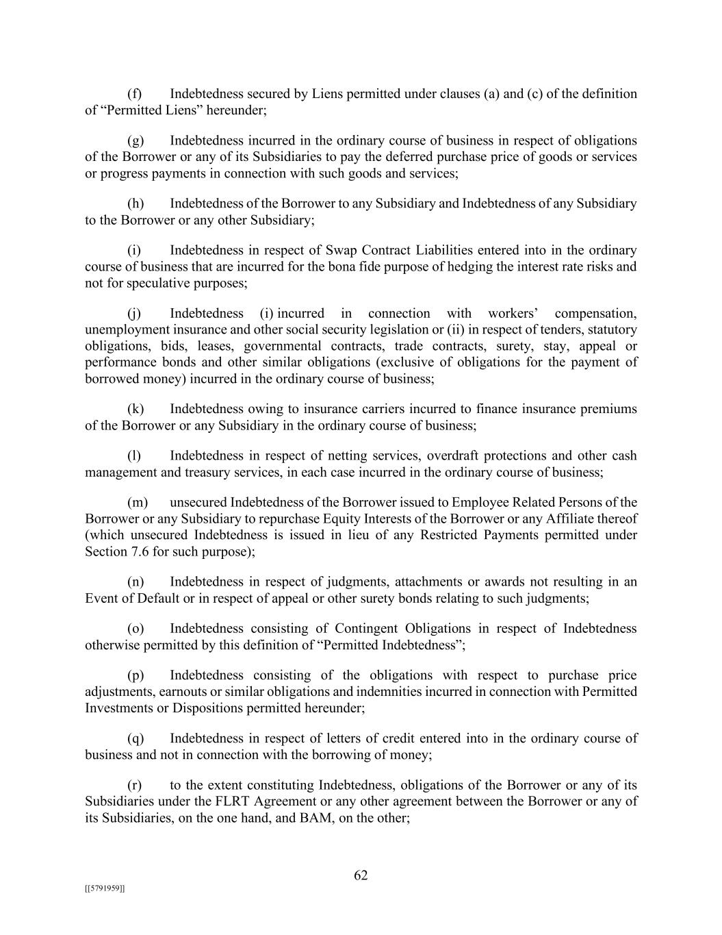 62 [[5791959]] (f) Indebtedness secured by Liens permitted under clauses (a) and (c) of the definition of “Permitted Liens” hereunder; (g) Indebtedness incurred in the ordinary course of business in respect of obligations of the Borrower or any of its Subsidiaries to pay the deferred purchase price of goods or services or progress payments in connection with such goods and services; (h) Indebtedness of the Borrower to any Subsidiary and Indebtedness of any Subsidiary to the Borrower or any other Subsidiary; (i) Indebtedness in respect of Swap Contract Liabilities entered into in the ordinary course of business that are incurred for the bona fide purpose of hedging the interest rate risks and not for speculative purposes; (j) Indebtedness (i) incurred in connection with workers’ compensation, unemployment insurance and other social security legislation or (ii) in respect of tenders, statutory obligations, bids, leases, governmental contracts, trade contracts, surety, stay, appeal or performance bonds and other similar obligations (exclusive of obligations for the payment of borrowed money) incurred in the ordinary course of business; (k) Indebtedness owing to insurance carriers incurred to finance insurance premiums of the Borrower or any Subsidiary in the ordinary course of business; (l) Indebtedness in respect of netting services, overdraft protections and other cash management and treasury services, in each case incurred in the ordinary course of business; (m) unsecured Indebtedness of the Borrower issued to Employee Related Persons of the Borrower or any Subsidiary to repurchase Equity Interests of the Borrower or any Affiliate thereof (which unsecured Indebtedness is issued in lieu of any Restricted Payments permitted under Section 7.6 for such purpose); (n) Indebtedness in respect of judgments, attachments or awards not resulting in an Event of Default or in respect of appeal or other surety bonds relating to such judgments; (o) Indebtedness consisting of Contingent Obligations in respect of Indebtedness otherwise permitted by this definition of “Permitted Indebtedness”; (p) Indebtedness consisting of the obligations with respect to purchase price adjustments, earnouts or similar obligations and indemnities incurred in connection with Permitted Investments or Dispositions permitted hereunder; (q) Indebtedness in respect of letters of credit entered into in the ordinary course of business and not in connection with the borrowing of money; (r) to the extent constituting Indebtedness, obligations of the Borrower or any of its Subsidiaries under the FLRT Agreement or any other agreement between the Borrower or any of its Subsidiaries, on the one hand, and BAM, on the other;