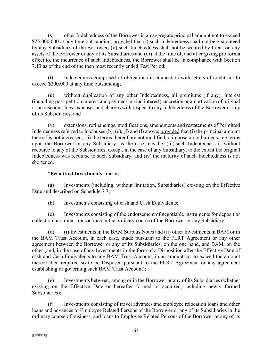 63 [[5791959]] (s) other Indebtedness of the Borrower in an aggregate principal amount not to exceed $25,000,000 at any time outstanding, provided that (i) such Indebtedness shall not be guaranteed by any Subsidiary of the Borrower, (ii) such Indebtedness shall not be secured by Liens on any assets of the Borrower or any of its Subsidiaries and (iii) at the time of, and after giving pro forma effect to, the incurrence of such Indebtedness, the Borrower shall be in compliance with Section 7.13 as of the end of the then most recently ended Test Period; (t) Indebtedness comprised of obligations in connection with letters of credit not to exceed $200,000 at any time outstanding; (u) without duplication of any other Indebtedness, all premiums (if any), interest (including post-petition interest and payment in kind interest), accretion or amortization of original issue discount, fees, expenses and charges with respect to any Indebtedness of the Borrower or any of its Subsidiaries; and (v) extensions, refinancings, modifications, amendments and restatements of Permitted Indebtedness referred to in clauses (b), (c), (f) and (l) above; provided that (i) the principal amount thereof is not increased, (ii) the terms thereof are not modified to impose more burdensome terms upon the Borrower or any Subsidiary, as the case may be, (iii) such Indebtedness is without recourse to any of the Subsidiaries, except, in the case of any Subsidiary, to the extent the original Indebtedness was recourse to such Subsidiary, and (iv) the maturity of such Indebtedness is not shortened. “Permitted Investments” means: (a) Investments (including, without limitation, Subsidiaries) existing on the Effective Date and described on Schedule 7.7; (b) Investments consisting of cash and Cash Equivalents; (c) Investments consisting of the endorsement of negotiable instruments for deposit or collection or similar transactions in the ordinary course of the Borrower or any Subsidiary; (d) (i) Investments in the BAM Surplus Notes and (ii) other Investments in BAM or in the BAM Trust Account, in each case, made pursuant to the FLRT Agreement or any other agreement between the Borrower or any of its Subsidiaries, on the one hand, and BAM, on the other (and, in the case of any Investments in the form of a Disposition after the Effective Date of cash and Cash Equivalents to any BAM Trust Account, in an amount not to exceed the amount thereof then required so to be Disposed pursuant to the FLRT Agreement or any agreement establishing or governing such BAM Trust Account); (e) Investments between, among or in the Borrower or any of its Subsidiaries (whether existing on the Effective Date or hereafter formed or acquired, including newly formed Subsidiaries); (f) Investments consisting of travel advances and employee relocation loans and other loans and advances to Employee Related Persons of the Borrower or any of its Subsidiaries in the ordinary course of business, and loans to Employee Related Persons of the Borrower or any of its