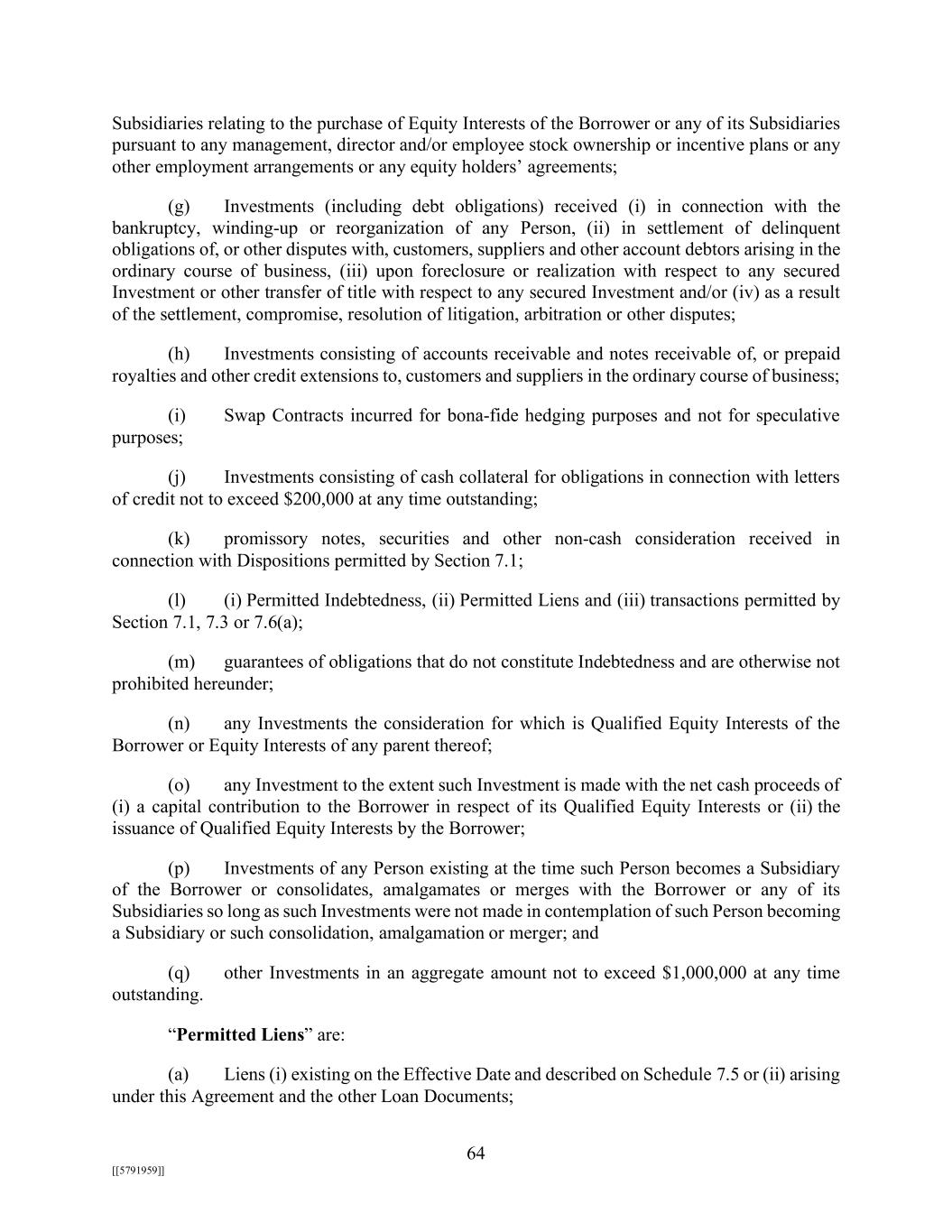 64 [[5791959]] Subsidiaries relating to the purchase of Equity Interests of the Borrower or any of its Subsidiaries pursuant to any management, director and/or employee stock ownership or incentive plans or any other employment arrangements or any equity holders’ agreements; (g) Investments (including debt obligations) received (i) in connection with the bankruptcy, winding-up or reorganization of any Person, (ii) in settlement of delinquent obligations of, or other disputes with, customers, suppliers and other account debtors arising in the ordinary course of business, (iii) upon foreclosure or realization with respect to any secured Investment or other transfer of title with respect to any secured Investment and/or (iv) as a result of the settlement, compromise, resolution of litigation, arbitration or other disputes; (h) Investments consisting of accounts receivable and notes receivable of, or prepaid royalties and other credit extensions to, customers and suppliers in the ordinary course of business; (i) Swap Contracts incurred for bona-fide hedging purposes and not for speculative purposes; (j) Investments consisting of cash collateral for obligations in connection with letters of credit not to exceed $200,000 at any time outstanding; (k) promissory notes, securities and other non-cash consideration received in connection with Dispositions permitted by Section 7.1; (l) (i) Permitted Indebtedness, (ii) Permitted Liens and (iii) transactions permitted by Section 7.1, 7.3 or 7.6(a); (m) guarantees of obligations that do not constitute Indebtedness and are otherwise not prohibited hereunder; (n) any Investments the consideration for which is Qualified Equity Interests of the Borrower or Equity Interests of any parent thereof; (o) any Investment to the extent such Investment is made with the net cash proceeds of (i) a capital contribution to the Borrower in respect of its Qualified Equity Interests or (ii) the issuance of Qualified Equity Interests by the Borrower; (p) Investments of any Person existing at the time such Person becomes a Subsidiary of the Borrower or consolidates, amalgamates or merges with the Borrower or any of its Subsidiaries so long as such Investments were not made in contemplation of such Person becoming a Subsidiary or such consolidation, amalgamation or merger; and (q) other Investments in an aggregate amount not to exceed $1,000,000 at any time outstanding. “Permitted Liens” are: (a) Liens (i) existing on the Effective Date and described on Schedule 7.5 or (ii) arising under this Agreement and the other Loan Documents;