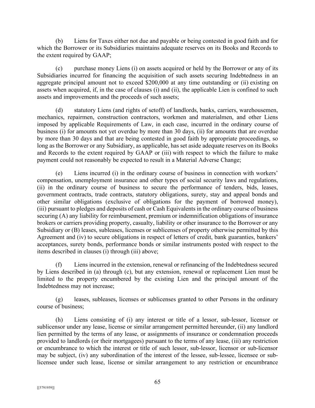 65 [[5791959]] (b) Liens for Taxes either not due and payable or being contested in good faith and for which the Borrower or its Subsidiaries maintains adequate reserves on its Books and Records to the extent required by GAAP; (c) purchase money Liens (i) on assets acquired or held by the Borrower or any of its Subsidiaries incurred for financing the acquisition of such assets securing Indebtedness in an aggregate principal amount not to exceed $200,000 at any time outstanding or (ii) existing on assets when acquired, if, in the case of clauses (i) and (ii), the applicable Lien is confined to such assets and improvements and the proceeds of such assets; (d) statutory Liens (and rights of setoff) of landlords, banks, carriers, warehousemen, mechanics, repairmen, construction contractors, workmen and materialmen, and other Liens imposed by applicable Requirements of Law, in each case, incurred in the ordinary course of business (i) for amounts not yet overdue by more than 30 days, (ii) for amounts that are overdue by more than 30 days and that are being contested in good faith by appropriate proceedings, so long as the Borrower or any Subsidiary, as applicable, has set aside adequate reserves on its Books and Records to the extent required by GAAP or (iii) with respect to which the failure to make payment could not reasonably be expected to result in a Material Adverse Change; (e) Liens incurred (i) in the ordinary course of business in connection with workers’ compensation, unemployment insurance and other types of social security laws and regulations, (ii) in the ordinary course of business to secure the performance of tenders, bids, leases, government contracts, trade contracts, statutory obligations, surety, stay and appeal bonds and other similar obligations (exclusive of obligations for the payment of borrowed money), (iii) pursuant to pledges and deposits of cash or Cash Equivalents in the ordinary course of business securing (A) any liability for reimbursement, premium or indemnification obligations of insurance brokers or carriers providing property, casualty, liability or other insurance to the Borrower or any Subsidiary or (B) leases, subleases, licenses or sublicenses of property otherwise permitted by this Agreement and (iv) to secure obligations in respect of letters of credit, bank guaranties, bankers’ acceptances, surety bonds, performance bonds or similar instruments posted with respect to the items described in clauses (i) through (iii) above; (f) Liens incurred in the extension, renewal or refinancing of the Indebtedness secured by Liens described in (a) through (c), but any extension, renewal or replacement Lien must be limited to the property encumbered by the existing Lien and the principal amount of the Indebtedness may not increase; (g) leases, subleases, licenses or sublicenses granted to other Persons in the ordinary course of business; (h) Liens consisting of (i) any interest or title of a lessor, sub-lessor, licensor or sublicensor under any lease, license or similar arrangement permitted hereunder, (ii) any landlord lien permitted by the terms of any lease, or assignments of insurance or condemnation proceeds provided to landlords (or their mortgagees) pursuant to the terms of any lease, (iii) any restriction or encumbrance to which the interest or title of such lessor, sub-lessor, licensor or sub-licensor may be subject, (iv) any subordination of the interest of the lessee, sub-lessee, licensee or sub- licensee under such lease, license or similar arrangement to any restriction or encumbrance