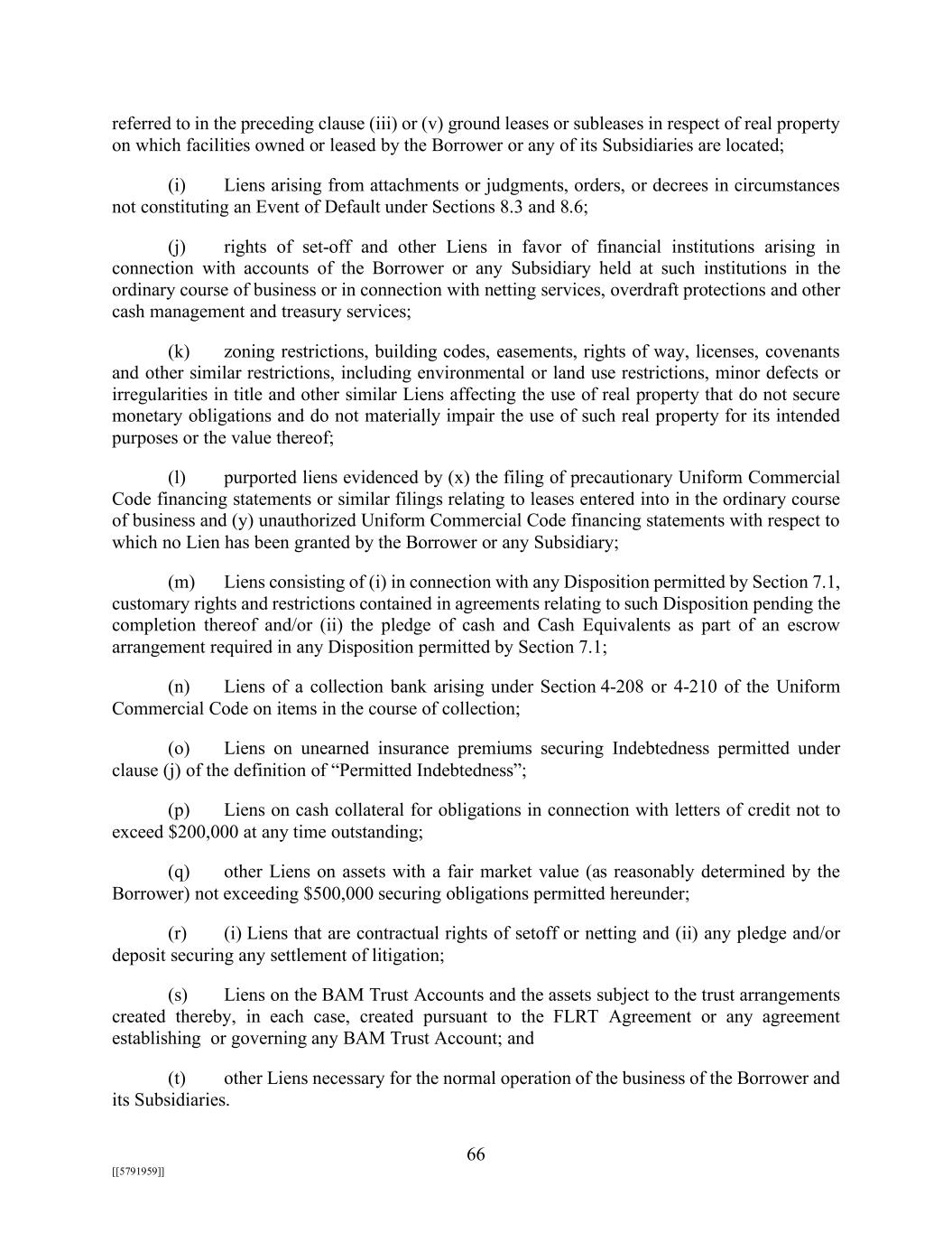 66 [[5791959]] referred to in the preceding clause (iii) or (v) ground leases or subleases in respect of real property on which facilities owned or leased by the Borrower or any of its Subsidiaries are located; (i) Liens arising from attachments or judgments, orders, or decrees in circumstances not constituting an Event of Default under Sections 8.3 and 8.6; (j) rights of set-off and other Liens in favor of financial institutions arising in connection with accounts of the Borrower or any Subsidiary held at such institutions in the ordinary course of business or in connection with netting services, overdraft protections and other cash management and treasury services; (k) zoning restrictions, building codes, easements, rights of way, licenses, covenants and other similar restrictions, including environmental or land use restrictions, minor defects or irregularities in title and other similar Liens affecting the use of real property that do not secure monetary obligations and do not materially impair the use of such real property for its intended purposes or the value thereof; (l) purported liens evidenced by (x) the filing of precautionary Uniform Commercial Code financing statements or similar filings relating to leases entered into in the ordinary course of business and (y) unauthorized Uniform Commercial Code financing statements with respect to which no Lien has been granted by the Borrower or any Subsidiary; (m) Liens consisting of (i) in connection with any Disposition permitted by Section 7.1, customary rights and restrictions contained in agreements relating to such Disposition pending the completion thereof and/or (ii) the pledge of cash and Cash Equivalents as part of an escrow arrangement required in any Disposition permitted by Section 7.1; (n) Liens of a collection bank arising under Section 4-208 or 4-210 of the Uniform Commercial Code on items in the course of collection; (o) Liens on unearned insurance premiums securing Indebtedness permitted under clause (j) of the definition of “Permitted Indebtedness”; (p) Liens on cash collateral for obligations in connection with letters of credit not to exceed $200,000 at any time outstanding; (q) other Liens on assets with a fair market value (as reasonably determined by the Borrower) not exceeding $500,000 securing obligations permitted hereunder; (r) (i) Liens that are contractual rights of setoff or netting and (ii) any pledge and/or deposit securing any settlement of litigation; (s) Liens on the BAM Trust Accounts and the assets subject to the trust arrangements created thereby, in each case, created pursuant to the FLRT Agreement or any agreement establishing or governing any BAM Trust Account; and (t) other Liens necessary for the normal operation of the business of the Borrower and its Subsidiaries.