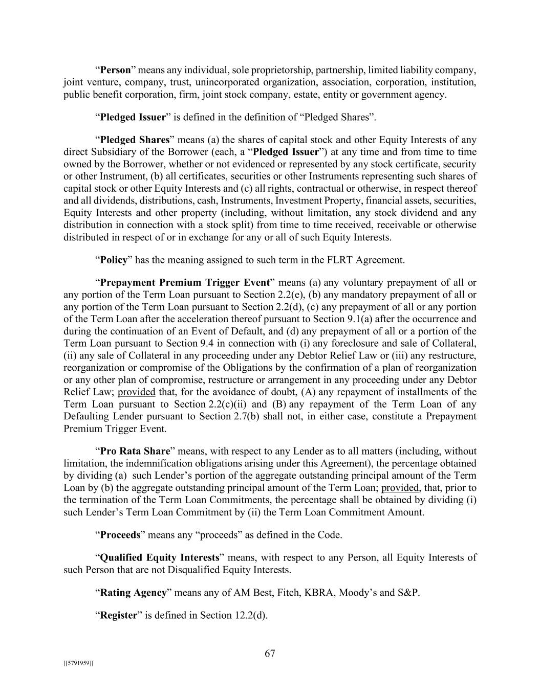 67 [[5791959]] “Person” means any individual, sole proprietorship, partnership, limited liability company, joint venture, company, trust, unincorporated organization, association, corporation, institution, public benefit corporation, firm, joint stock company, estate, entity or government agency. “Pledged Issuer” is defined in the definition of “Pledged Shares”. “Pledged Shares” means (a) the shares of capital stock and other Equity Interests of any direct Subsidiary of the Borrower (each, a “Pledged Issuer”) at any time and from time to time owned by the Borrower, whether or not evidenced or represented by any stock certificate, security or other Instrument, (b) all certificates, securities or other Instruments representing such shares of capital stock or other Equity Interests and (c) all rights, contractual or otherwise, in respect thereof and all dividends, distributions, cash, Instruments, Investment Property, financial assets, securities, Equity Interests and other property (including, without limitation, any stock dividend and any distribution in connection with a stock split) from time to time received, receivable or otherwise distributed in respect of or in exchange for any or all of such Equity Interests. “Policy” has the meaning assigned to such term in the FLRT Agreement. “Prepayment Premium Trigger Event” means (a) any voluntary prepayment of all or any portion of the Term Loan pursuant to Section 2.2(e), (b) any mandatory prepayment of all or any portion of the Term Loan pursuant to Section 2.2(d), (c) any prepayment of all or any portion of the Term Loan after the acceleration thereof pursuant to Section 9.1(a) after the occurrence and during the continuation of an Event of Default, and (d) any prepayment of all or a portion of the Term Loan pursuant to Section 9.4 in connection with (i) any foreclosure and sale of Collateral, (ii) any sale of Collateral in any proceeding under any Debtor Relief Law or (iii) any restructure, reorganization or compromise of the Obligations by the confirmation of a plan of reorganization or any other plan of compromise, restructure or arrangement in any proceeding under any Debtor Relief Law; provided that, for the avoidance of doubt, (A) any repayment of installments of the Term Loan pursuant to Section 2.2(c)(ii) and (B) any repayment of the Term Loan of any Defaulting Lender pursuant to Section 2.7(b) shall not, in either case, constitute a Prepayment Premium Trigger Event. “Pro Rata Share” means, with respect to any Lender as to all matters (including, without limitation, the indemnification obligations arising under this Agreement), the percentage obtained by dividing (a) such Lender’s portion of the aggregate outstanding principal amount of the Term Loan by (b) the aggregate outstanding principal amount of the Term Loan; provided, that, prior to the termination of the Term Loan Commitments, the percentage shall be obtained by dividing (i) such Lender’s Term Loan Commitment by (ii) the Term Loan Commitment Amount. “Proceeds” means any “proceeds” as defined in the Code. “Qualified Equity Interests” means, with respect to any Person, all Equity Interests of such Person that are not Disqualified Equity Interests. “Rating Agency” means any of AM Best, Fitch, KBRA, Moody’s and S&P. “Register” is defined in Section 12.2(d).