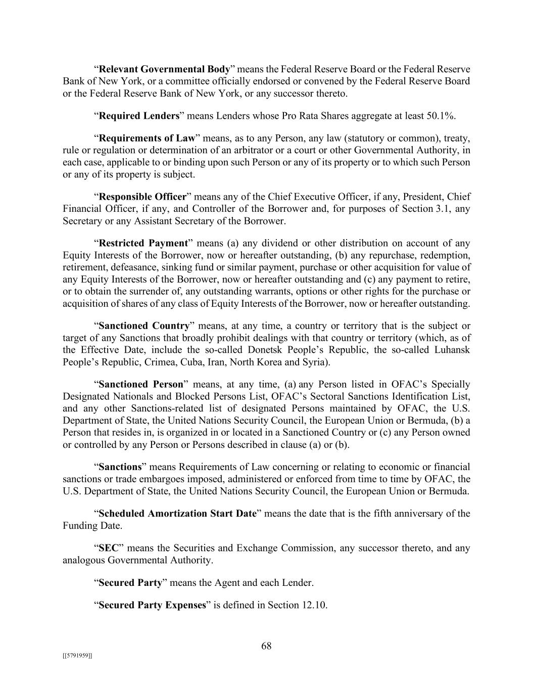 68 [[5791959]] “Relevant Governmental Body” means the Federal Reserve Board or the Federal Reserve Bank of New York, or a committee officially endorsed or convened by the Federal Reserve Board or the Federal Reserve Bank of New York, or any successor thereto. “Required Lenders” means Lenders whose Pro Rata Shares aggregate at least 50.1%. “Requirements of Law” means, as to any Person, any law (statutory or common), treaty, rule or regulation or determination of an arbitrator or a court or other Governmental Authority, in each case, applicable to or binding upon such Person or any of its property or to which such Person or any of its property is subject. “Responsible Officer” means any of the Chief Executive Officer, if any, President, Chief Financial Officer, if any, and Controller of the Borrower and, for purposes of Section 3.1, any Secretary or any Assistant Secretary of the Borrower. “Restricted Payment” means (a) any dividend or other distribution on account of any Equity Interests of the Borrower, now or hereafter outstanding, (b) any repurchase, redemption, retirement, defeasance, sinking fund or similar payment, purchase or other acquisition for value of any Equity Interests of the Borrower, now or hereafter outstanding and (c) any payment to retire, or to obtain the surrender of, any outstanding warrants, options or other rights for the purchase or acquisition of shares of any class of Equity Interests of the Borrower, now or hereafter outstanding. “Sanctioned Country” means, at any time, a country or territory that is the subject or target of any Sanctions that broadly prohibit dealings with that country or territory (which, as of the Effective Date, include the so-called Donetsk People’s Republic, the so-called Luhansk People’s Republic, Crimea, Cuba, Iran, North Korea and Syria). “Sanctioned Person” means, at any time, (a) any Person listed in OFAC’s Specially Designated Nationals and Blocked Persons List, OFAC’s Sectoral Sanctions Identification List, and any other Sanctions-related list of designated Persons maintained by OFAC, the U.S. Department of State, the United Nations Security Council, the European Union or Bermuda, (b) a Person that resides in, is organized in or located in a Sanctioned Country or (c) any Person owned or controlled by any Person or Persons described in clause (a) or (b). “Sanctions” means Requirements of Law concerning or relating to economic or financial sanctions or trade embargoes imposed, administered or enforced from time to time by OFAC, the U.S. Department of State, the United Nations Security Council, the European Union or Bermuda. “Scheduled Amortization Start Date” means the date that is the fifth anniversary of the Funding Date. “SEC” means the Securities and Exchange Commission, any successor thereto, and any analogous Governmental Authority. “Secured Party” means the Agent and each Lender. “Secured Party Expenses” is defined in Section 12.10.