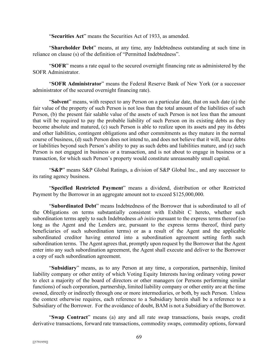 69 [[5791959]] “Securities Act” means the Securities Act of 1933, as amended. “Shareholder Debt” means, at any time, any Indebtedness outstanding at such time in reliance on clause (s) of the definition of “Permitted Indebtedness”. “SOFR” means a rate equal to the secured overnight financing rate as administered by the SOFR Administrator. “SOFR Administrator” means the Federal Reserve Bank of New York (or a successor administrator of the secured overnight financing rate). “Solvent” means, with respect to any Person on a particular date, that on such date (a) the fair value of the property of such Person is not less than the total amount of the liabilities of such Person, (b) the present fair salable value of the assets of such Person is not less than the amount that will be required to pay the probable liability of such Person on its existing debts as they become absolute and matured, (c) such Person is able to realize upon its assets and pay its debts and other liabilities, contingent obligations and other commitments as they mature in the normal course of business, (d) such Person does not intend to, and does not believe that it will, incur debts or liabilities beyond such Person’s ability to pay as such debts and liabilities mature, and (e) such Person is not engaged in business or a transaction, and is not about to engage in business or a transaction, for which such Person’s property would constitute unreasonably small capital. “S&P” means S&P Global Ratings, a division of S&P Global Inc., and any successor to its rating agency business. “Specified Restricted Payment” means a dividend, distribution or other Restricted Payment by the Borrower in an aggregate amount not to exceed $125,000,000. “Subordinated Debt” means Indebtedness of the Borrower that is subordinated to all of the Obligations on terms substantially consistent with Exhibit C hereto, whether such subordination terms apply to such Indebtedness ab initio pursuant to the express terms thereof (so long as the Agent and the Lenders are, pursuant to the express terms thereof, third party beneficiaries of such subordination terms) or as a result of the Agent and the applicable subordinated creditor having entered into a subordination agreement setting forth such subordination terms. The Agent agrees that, promptly upon request by the Borrower that the Agent enter into any such subordination agreement, the Agent shall execute and deliver to the Borrower a copy of such subordination agreement. “Subsidiary” means, as to any Person at any time, a corporation, partnership, limited liability company or other entity of which Voting Equity Interests having ordinary voting power to elect a majority of the board of directors or other managers (or Persons performing similar functions) of such corporation, partnership, limited liability company or other entity are at the time owned, directly or indirectly through one or more intermediaries, or both, by such Person. Unless the context otherwise requires, each reference to a Subsidiary herein shall be a reference to a Subsidiary of the Borrower. For the avoidance of doubt, BAM is not a Subsidiary of the Borrower. “Swap Contract” means (a) any and all rate swap transactions, basis swaps, credit derivative transactions, forward rate transactions, commodity swaps, commodity options, forward