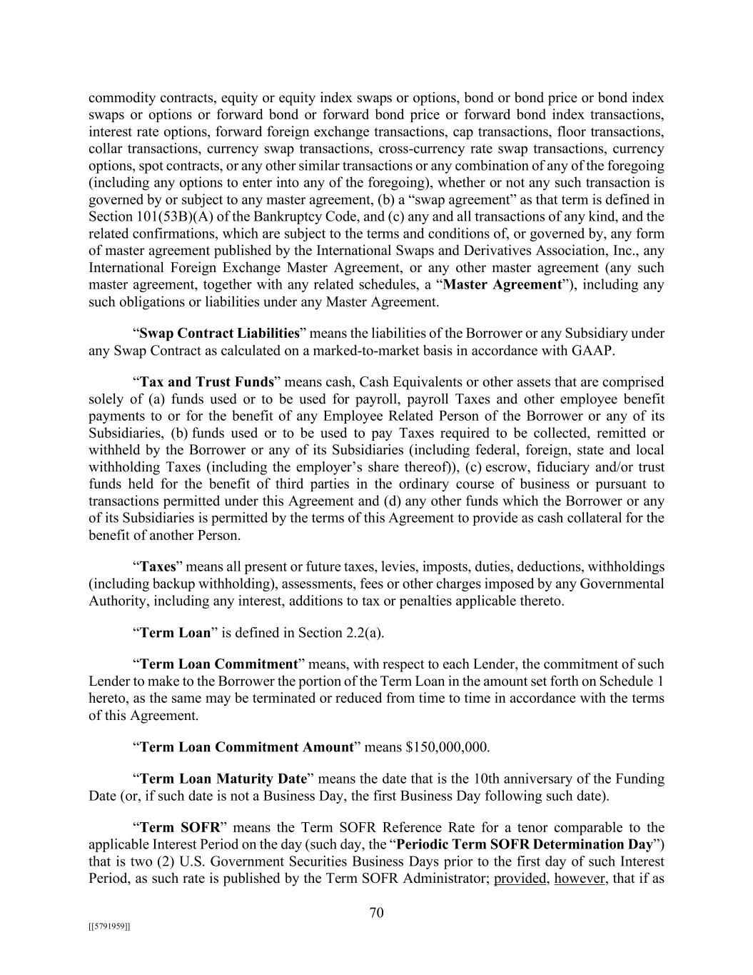 70 [[5791959]] commodity contracts, equity or equity index swaps or options, bond or bond price or bond index swaps or options or forward bond or forward bond price or forward bond index transactions, interest rate options, forward foreign exchange transactions, cap transactions, floor transactions, collar transactions, currency swap transactions, cross-currency rate swap transactions, currency options, spot contracts, or any other similar transactions or any combination of any of the foregoing (including any options to enter into any of the foregoing), whether or not any such transaction is governed by or subject to any master agreement, (b) a “swap agreement” as that term is defined in Section 101(53B)(A) of the Bankruptcy Code, and (c) any and all transactions of any kind, and the related confirmations, which are subject to the terms and conditions of, or governed by, any form of master agreement published by the International Swaps and Derivatives Association, Inc., any International Foreign Exchange Master Agreement, or any other master agreement (any such master agreement, together with any related schedules, a “Master Agreement”), including any such obligations or liabilities under any Master Agreement. “Swap Contract Liabilities” means the liabilities of the Borrower or any Subsidiary under any Swap Contract as calculated on a marked-to-market basis in accordance with GAAP. “Tax and Trust Funds” means cash, Cash Equivalents or other assets that are comprised solely of (a) funds used or to be used for payroll, payroll Taxes and other employee benefit payments to or for the benefit of any Employee Related Person of the Borrower or any of its Subsidiaries, (b) funds used or to be used to pay Taxes required to be collected, remitted or withheld by the Borrower or any of its Subsidiaries (including federal, foreign, state and local withholding Taxes (including the employer’s share thereof)), (c) escrow, fiduciary and/or trust funds held for the benefit of third parties in the ordinary course of business or pursuant to transactions permitted under this Agreement and (d) any other funds which the Borrower or any of its Subsidiaries is permitted by the terms of this Agreement to provide as cash collateral for the benefit of another Person. “Taxes” means all present or future taxes, levies, imposts, duties, deductions, withholdings (including backup withholding), assessments, fees or other charges imposed by any Governmental Authority, including any interest, additions to tax or penalties applicable thereto. “Term Loan” is defined in Section 2.2(a). “Term Loan Commitment” means, with respect to each Lender, the commitment of such Lender to make to the Borrower the portion of the Term Loan in the amount set forth on Schedule 1 hereto, as the same may be terminated or reduced from time to time in accordance with the terms of this Agreement. “Term Loan Commitment Amount” means $150,000,000. “Term Loan Maturity Date” means the date that is the 10th anniversary of the Funding Date (or, if such date is not a Business Day, the first Business Day following such date). “Term SOFR” means the Term SOFR Reference Rate for a tenor comparable to the applicable Interest Period on the day (such day, the “Periodic Term SOFR Determination Day”) that is two (2) U.S. Government Securities Business Days prior to the first day of such Interest Period, as such rate is published by the Term SOFR Administrator; provided, however, that if as