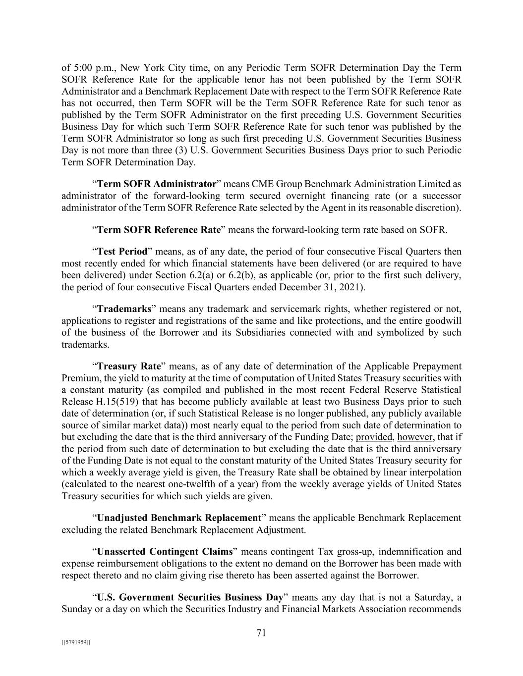 71 [[5791959]] of 5:00 p.m., New York City time, on any Periodic Term SOFR Determination Day the Term SOFR Reference Rate for the applicable tenor has not been published by the Term SOFR Administrator and a Benchmark Replacement Date with respect to the Term SOFR Reference Rate has not occurred, then Term SOFR will be the Term SOFR Reference Rate for such tenor as published by the Term SOFR Administrator on the first preceding U.S. Government Securities Business Day for which such Term SOFR Reference Rate for such tenor was published by the Term SOFR Administrator so long as such first preceding U.S. Government Securities Business Day is not more than three (3) U.S. Government Securities Business Days prior to such Periodic Term SOFR Determination Day. “Term SOFR Administrator” means CME Group Benchmark Administration Limited as administrator of the forward-looking term secured overnight financing rate (or a successor administrator of the Term SOFR Reference Rate selected by the Agent in its reasonable discretion). “Term SOFR Reference Rate” means the forward-looking term rate based on SOFR. “Test Period” means, as of any date, the period of four consecutive Fiscal Quarters then most recently ended for which financial statements have been delivered (or are required to have been delivered) under Section 6.2(a) or 6.2(b), as applicable (or, prior to the first such delivery, the period of four consecutive Fiscal Quarters ended December 31, 2021). “Trademarks” means any trademark and servicemark rights, whether registered or not, applications to register and registrations of the same and like protections, and the entire goodwill of the business of the Borrower and its Subsidiaries connected with and symbolized by such trademarks. “Treasury Rate” means, as of any date of determination of the Applicable Prepayment Premium, the yield to maturity at the time of computation of United States Treasury securities with a constant maturity (as compiled and published in the most recent Federal Reserve Statistical Release H.15(519) that has become publicly available at least two Business Days prior to such date of determination (or, if such Statistical Release is no longer published, any publicly available source of similar market data)) most nearly equal to the period from such date of determination to but excluding the date that is the third anniversary of the Funding Date; provided, however, that if the period from such date of determination to but excluding the date that is the third anniversary of the Funding Date is not equal to the constant maturity of the United States Treasury security for which a weekly average yield is given, the Treasury Rate shall be obtained by linear interpolation (calculated to the nearest one-twelfth of a year) from the weekly average yields of United States Treasury securities for which such yields are given. “Unadjusted Benchmark Replacement” means the applicable Benchmark Replacement excluding the related Benchmark Replacement Adjustment. “Unasserted Contingent Claims” means contingent Tax gross-up, indemnification and expense reimbursement obligations to the extent no demand on the Borrower has been made with respect thereto and no claim giving rise thereto has been asserted against the Borrower. “U.S. Government Securities Business Day” means any day that is not a Saturday, a Sunday or a day on which the Securities Industry and Financial Markets Association recommends