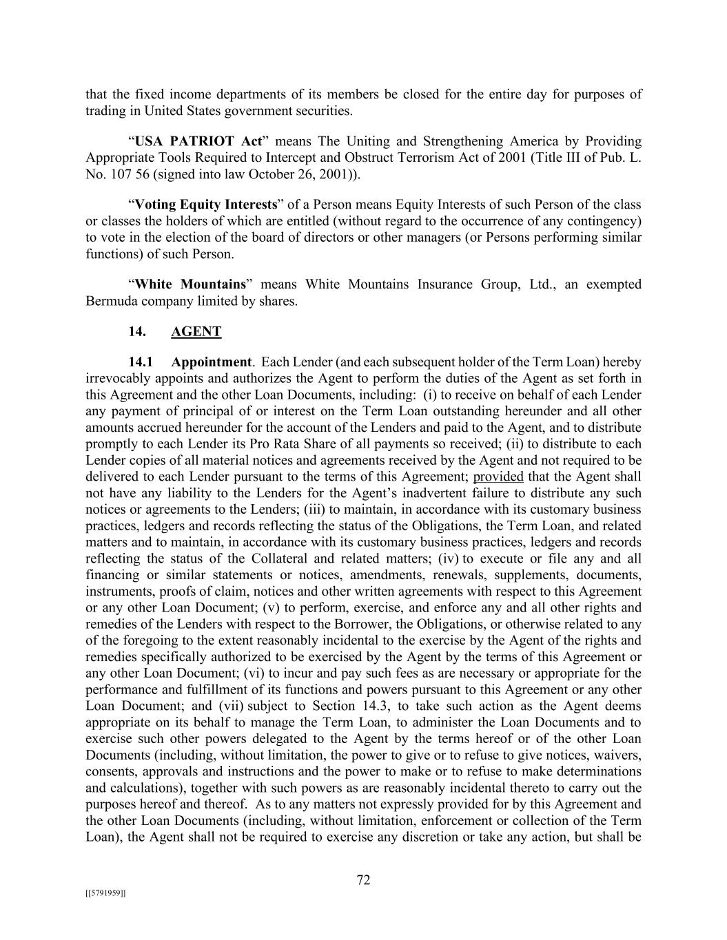 72 [[5791959]] that the fixed income departments of its members be closed for the entire day for purposes of trading in United States government securities. “USA PATRIOT Act” means The Uniting and Strengthening America by Providing Appropriate Tools Required to Intercept and Obstruct Terrorism Act of 2001 (Title III of Pub. L. No. 107 56 (signed into law October 26, 2001)). “Voting Equity Interests” of a Person means Equity Interests of such Person of the class or classes the holders of which are entitled (without regard to the occurrence of any contingency) to vote in the election of the board of directors or other managers (or Persons performing similar functions) of such Person. “White Mountains” means White Mountains Insurance Group, Ltd., an exempted Bermuda company limited by shares. 14. AGENT 14.1 Appointment. Each Lender (and each subsequent holder of the Term Loan) hereby irrevocably appoints and authorizes the Agent to perform the duties of the Agent as set forth in this Agreement and the other Loan Documents, including: (i) to receive on behalf of each Lender any payment of principal of or interest on the Term Loan outstanding hereunder and all other amounts accrued hereunder for the account of the Lenders and paid to the Agent, and to distribute promptly to each Lender its Pro Rata Share of all payments so received; (ii) to distribute to each Lender copies of all material notices and agreements received by the Agent and not required to be delivered to each Lender pursuant to the terms of this Agreement; provided that the Agent shall not have any liability to the Lenders for the Agent’s inadvertent failure to distribute any such notices or agreements to the Lenders; (iii) to maintain, in accordance with its customary business practices, ledgers and records reflecting the status of the Obligations, the Term Loan, and related matters and to maintain, in accordance with its customary business practices, ledgers and records reflecting the status of the Collateral and related matters; (iv) to execute or file any and all financing or similar statements or notices, amendments, renewals, supplements, documents, instruments, proofs of claim, notices and other written agreements with respect to this Agreement or any other Loan Document; (v) to perform, exercise, and enforce any and all other rights and remedies of the Lenders with respect to the Borrower, the Obligations, or otherwise related to any of the foregoing to the extent reasonably incidental to the exercise by the Agent of the rights and remedies specifically authorized to be exercised by the Agent by the terms of this Agreement or any other Loan Document; (vi) to incur and pay such fees as are necessary or appropriate for the performance and fulfillment of its functions and powers pursuant to this Agreement or any other Loan Document; and (vii) subject to Section 14.3, to take such action as the Agent deems appropriate on its behalf to manage the Term Loan, to administer the Loan Documents and to exercise such other powers delegated to the Agent by the terms hereof or of the other Loan Documents (including, without limitation, the power to give or to refuse to give notices, waivers, consents, approvals and instructions and the power to make or to refuse to make determinations and calculations), together with such powers as are reasonably incidental thereto to carry out the purposes hereof and thereof. As to any matters not expressly provided for by this Agreement and the other Loan Documents (including, without limitation, enforcement or collection of the Term Loan), the Agent shall not be required to exercise any discretion or take any action, but shall be
