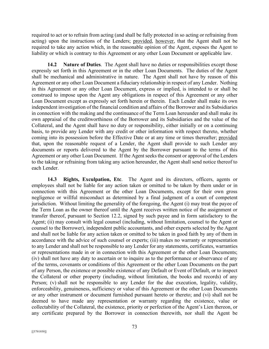 73 [[5791959]] required to act or to refrain from acting (and shall be fully protected in so acting or refraining from acting) upon the instructions of the Lenders; provided, however, that the Agent shall not be required to take any action which, in the reasonable opinion of the Agent, exposes the Agent to liability or which is contrary to this Agreement or any other Loan Document or applicable law. 14.2 Nature of Duties. The Agent shall have no duties or responsibilities except those expressly set forth in this Agreement or in the other Loan Documents. The duties of the Agent shall be mechanical and administrative in nature. The Agent shall not have by reason of this Agreement or any other Loan Document a fiduciary relationship in respect of any Lender. Nothing in this Agreement or any other Loan Document, express or implied, is intended to or shall be construed to impose upon the Agent any obligations in respect of this Agreement or any other Loan Document except as expressly set forth herein or therein. Each Lender shall make its own independent investigation of the financial condition and affairs of the Borrower and its Subsidiaries in connection with the making and the continuance of the Term Loan hereunder and shall make its own appraisal of the creditworthiness of the Borrower and its Subsidiaries and the value of the Collateral, and the Agent shall have no duty or responsibility, either initially or on a continuing basis, to provide any Lender with any credit or other information with respect thereto, whether coming into its possession before the Effective Date or at any time or times thereafter; provided that, upon the reasonable request of a Lender, the Agent shall provide to such Lender any documents or reports delivered to the Agent by the Borrower pursuant to the terms of this Agreement or any other Loan Document. If the Agent seeks the consent or approval of the Lenders to the taking or refraining from taking any action hereunder, the Agent shall send notice thereof to each Lender. 14.3 Rights, Exculpation, Etc. The Agent and its directors, officers, agents or employees shall not be liable for any action taken or omitted to be taken by them under or in connection with this Agreement or the other Loan Documents, except for their own gross negligence or willful misconduct as determined by a final judgment of a court of competent jurisdiction. Without limiting the generality of the foregoing, the Agent (i) may treat the payee of the Term Loan as the owner thereof until the Agent receives written notice of the assignment or transfer thereof, pursuant to Section 12.2, signed by such payee and in form satisfactory to the Agent; (ii) may consult with legal counsel (including, without limitation, counsel to the Agent or counsel to the Borrower), independent public accountants, and other experts selected by the Agent and shall not be liable for any action taken or omitted to be taken in good faith by any of them in accordance with the advice of such counsel or experts; (iii) makes no warranty or representation to any Lender and shall not be responsible to any Lender for any statements, certificates, warranties or representations made in or in connection with this Agreement or the other Loan Documents; (iv) shall not have any duty to ascertain or to inquire as to the performance or observance of any of the terms, covenants or conditions of this Agreement or the other Loan Documents on the part of any Person, the existence or possible existence of any Default or Event of Default, or to inspect the Collateral or other property (including, without limitation, the books and records) of any Person; (v) shall not be responsible to any Lender for the due execution, legality, validity, enforceability, genuineness, sufficiency or value of this Agreement or the other Loan Documents or any other instrument or document furnished pursuant hereto or thereto; and (vi) shall not be deemed to have made any representation or warranty regarding the existence, value or collectability of the Collateral, the existence, priority or perfection of the Agent’s Lien thereon, or any certificate prepared by the Borrower in connection therewith, nor shall the Agent be