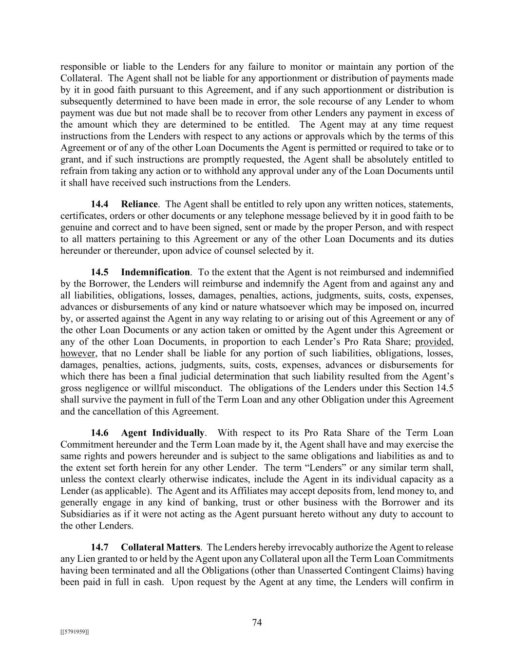 74 [[5791959]] responsible or liable to the Lenders for any failure to monitor or maintain any portion of the Collateral. The Agent shall not be liable for any apportionment or distribution of payments made by it in good faith pursuant to this Agreement, and if any such apportionment or distribution is subsequently determined to have been made in error, the sole recourse of any Lender to whom payment was due but not made shall be to recover from other Lenders any payment in excess of the amount which they are determined to be entitled. The Agent may at any time request instructions from the Lenders with respect to any actions or approvals which by the terms of this Agreement or of any of the other Loan Documents the Agent is permitted or required to take or to grant, and if such instructions are promptly requested, the Agent shall be absolutely entitled to refrain from taking any action or to withhold any approval under any of the Loan Documents until it shall have received such instructions from the Lenders. 14.4 Reliance. The Agent shall be entitled to rely upon any written notices, statements, certificates, orders or other documents or any telephone message believed by it in good faith to be genuine and correct and to have been signed, sent or made by the proper Person, and with respect to all matters pertaining to this Agreement or any of the other Loan Documents and its duties hereunder or thereunder, upon advice of counsel selected by it. 14.5 Indemnification. To the extent that the Agent is not reimbursed and indemnified by the Borrower, the Lenders will reimburse and indemnify the Agent from and against any and all liabilities, obligations, losses, damages, penalties, actions, judgments, suits, costs, expenses, advances or disbursements of any kind or nature whatsoever which may be imposed on, incurred by, or asserted against the Agent in any way relating to or arising out of this Agreement or any of the other Loan Documents or any action taken or omitted by the Agent under this Agreement or any of the other Loan Documents, in proportion to each Lender’s Pro Rata Share; provided, however, that no Lender shall be liable for any portion of such liabilities, obligations, losses, damages, penalties, actions, judgments, suits, costs, expenses, advances or disbursements for which there has been a final judicial determination that such liability resulted from the Agent’s gross negligence or willful misconduct. The obligations of the Lenders under this Section 14.5 shall survive the payment in full of the Term Loan and any other Obligation under this Agreement and the cancellation of this Agreement. 14.6 Agent Individually. With respect to its Pro Rata Share of the Term Loan Commitment hereunder and the Term Loan made by it, the Agent shall have and may exercise the same rights and powers hereunder and is subject to the same obligations and liabilities as and to the extent set forth herein for any other Lender. The term “Lenders” or any similar term shall, unless the context clearly otherwise indicates, include the Agent in its individual capacity as a Lender (as applicable). The Agent and its Affiliates may accept deposits from, lend money to, and generally engage in any kind of banking, trust or other business with the Borrower and its Subsidiaries as if it were not acting as the Agent pursuant hereto without any duty to account to the other Lenders. 14.7 Collateral Matters. The Lenders hereby irrevocably authorize the Agent to release any Lien granted to or held by the Agent upon any Collateral upon all the Term Loan Commitments having been terminated and all the Obligations (other than Unasserted Contingent Claims) having been paid in full in cash. Upon request by the Agent at any time, the Lenders will confirm in