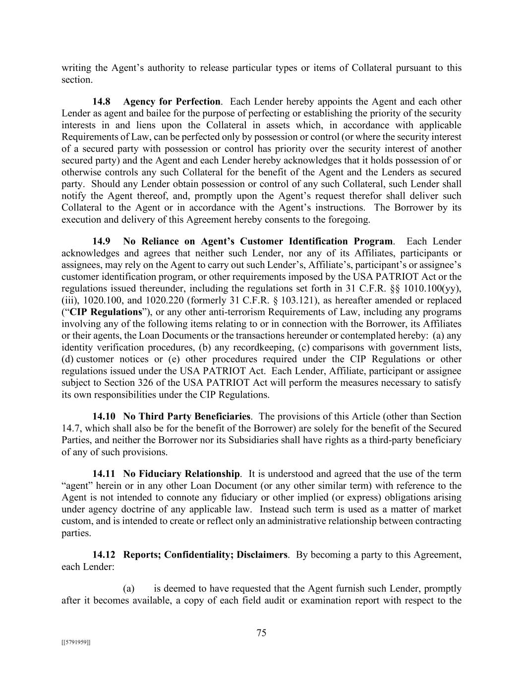 75 [[5791959]] writing the Agent’s authority to release particular types or items of Collateral pursuant to this section. 14.8 Agency for Perfection. Each Lender hereby appoints the Agent and each other Lender as agent and bailee for the purpose of perfecting or establishing the priority of the security interests in and liens upon the Collateral in assets which, in accordance with applicable Requirements of Law, can be perfected only by possession or control (or where the security interest of a secured party with possession or control has priority over the security interest of another secured party) and the Agent and each Lender hereby acknowledges that it holds possession of or otherwise controls any such Collateral for the benefit of the Agent and the Lenders as secured party. Should any Lender obtain possession or control of any such Collateral, such Lender shall notify the Agent thereof, and, promptly upon the Agent’s request therefor shall deliver such Collateral to the Agent or in accordance with the Agent’s instructions. The Borrower by its execution and delivery of this Agreement hereby consents to the foregoing. 14.9 No Reliance on Agent’s Customer Identification Program. Each Lender acknowledges and agrees that neither such Lender, nor any of its Affiliates, participants or assignees, may rely on the Agent to carry out such Lender’s, Affiliate’s, participant’s or assignee’s customer identification program, or other requirements imposed by the USA PATRIOT Act or the regulations issued thereunder, including the regulations set forth in 31 C.F.R. §§ 1010.100(yy), (iii), 1020.100, and 1020.220 (formerly 31 C.F.R. § 103.121), as hereafter amended or replaced (“CIP Regulations”), or any other anti-terrorism Requirements of Law, including any programs involving any of the following items relating to or in connection with the Borrower, its Affiliates or their agents, the Loan Documents or the transactions hereunder or contemplated hereby: (a) any identity verification procedures, (b) any recordkeeping, (c) comparisons with government lists, (d) customer notices or (e) other procedures required under the CIP Regulations or other regulations issued under the USA PATRIOT Act. Each Lender, Affiliate, participant or assignee subject to Section 326 of the USA PATRIOT Act will perform the measures necessary to satisfy its own responsibilities under the CIP Regulations. 14.10 No Third Party Beneficiaries. The provisions of this Article (other than Section 14.7, which shall also be for the benefit of the Borrower) are solely for the benefit of the Secured Parties, and neither the Borrower nor its Subsidiaries shall have rights as a third-party beneficiary of any of such provisions. 14.11 No Fiduciary Relationship. It is understood and agreed that the use of the term “agent” herein or in any other Loan Document (or any other similar term) with reference to the Agent is not intended to connote any fiduciary or other implied (or express) obligations arising under agency doctrine of any applicable law. Instead such term is used as a matter of market custom, and is intended to create or reflect only an administrative relationship between contracting parties. 14.12 Reports; Confidentiality; Disclaimers. By becoming a party to this Agreement, each Lender: (a) is deemed to have requested that the Agent furnish such Lender, promptly after it becomes available, a copy of each field audit or examination report with respect to the