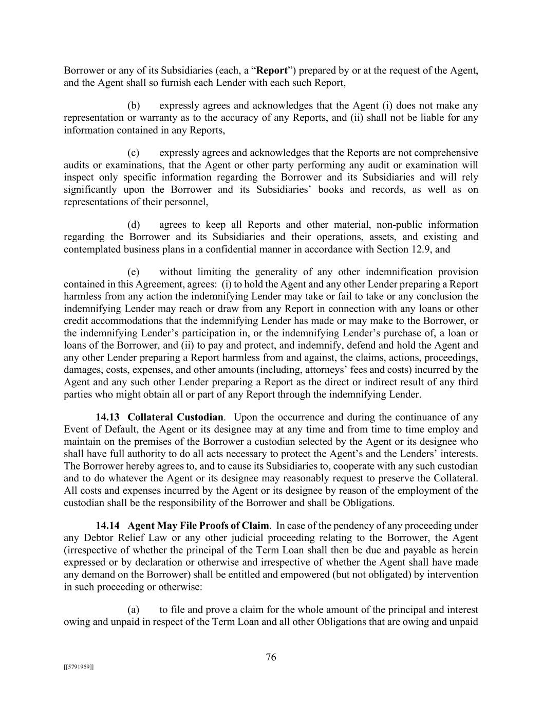 76 [[5791959]] Borrower or any of its Subsidiaries (each, a “Report”) prepared by or at the request of the Agent, and the Agent shall so furnish each Lender with each such Report, (b) expressly agrees and acknowledges that the Agent (i) does not make any representation or warranty as to the accuracy of any Reports, and (ii) shall not be liable for any information contained in any Reports, (c) expressly agrees and acknowledges that the Reports are not comprehensive audits or examinations, that the Agent or other party performing any audit or examination will inspect only specific information regarding the Borrower and its Subsidiaries and will rely significantly upon the Borrower and its Subsidiaries’ books and records, as well as on representations of their personnel, (d) agrees to keep all Reports and other material, non-public information regarding the Borrower and its Subsidiaries and their operations, assets, and existing and contemplated business plans in a confidential manner in accordance with Section 12.9, and (e) without limiting the generality of any other indemnification provision contained in this Agreement, agrees: (i) to hold the Agent and any other Lender preparing a Report harmless from any action the indemnifying Lender may take or fail to take or any conclusion the indemnifying Lender may reach or draw from any Report in connection with any loans or other credit accommodations that the indemnifying Lender has made or may make to the Borrower, or the indemnifying Lender’s participation in, or the indemnifying Lender’s purchase of, a loan or loans of the Borrower, and (ii) to pay and protect, and indemnify, defend and hold the Agent and any other Lender preparing a Report harmless from and against, the claims, actions, proceedings, damages, costs, expenses, and other amounts (including, attorneys’ fees and costs) incurred by the Agent and any such other Lender preparing a Report as the direct or indirect result of any third parties who might obtain all or part of any Report through the indemnifying Lender. 14.13 Collateral Custodian. Upon the occurrence and during the continuance of any Event of Default, the Agent or its designee may at any time and from time to time employ and maintain on the premises of the Borrower a custodian selected by the Agent or its designee who shall have full authority to do all acts necessary to protect the Agent’s and the Lenders’ interests. The Borrower hereby agrees to, and to cause its Subsidiaries to, cooperate with any such custodian and to do whatever the Agent or its designee may reasonably request to preserve the Collateral. All costs and expenses incurred by the Agent or its designee by reason of the employment of the custodian shall be the responsibility of the Borrower and shall be Obligations. 14.14 Agent May File Proofs of Claim. In case of the pendency of any proceeding under any Debtor Relief Law or any other judicial proceeding relating to the Borrower, the Agent (irrespective of whether the principal of the Term Loan shall then be due and payable as herein expressed or by declaration or otherwise and irrespective of whether the Agent shall have made any demand on the Borrower) shall be entitled and empowered (but not obligated) by intervention in such proceeding or otherwise: (a) to file and prove a claim for the whole amount of the principal and interest owing and unpaid in respect of the Term Loan and all other Obligations that are owing and unpaid