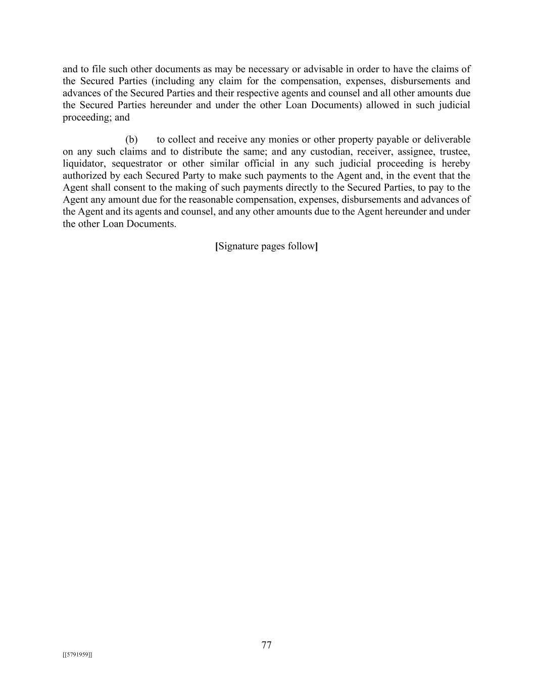 77 [[5791959]] and to file such other documents as may be necessary or advisable in order to have the claims of the Secured Parties (including any claim for the compensation, expenses, disbursements and advances of the Secured Parties and their respective agents and counsel and all other amounts due the Secured Parties hereunder and under the other Loan Documents) allowed in such judicial proceeding; and (b) to collect and receive any monies or other property payable or deliverable on any such claims and to distribute the same; and any custodian, receiver, assignee, trustee, liquidator, sequestrator or other similar official in any such judicial proceeding is hereby authorized by each Secured Party to make such payments to the Agent and, in the event that the Agent shall consent to the making of such payments directly to the Secured Parties, to pay to the Agent any amount due for the reasonable compensation, expenses, disbursements and advances of the Agent and its agents and counsel, and any other amounts due to the Agent hereunder and under the other Loan Documents. [Signature pages follow]