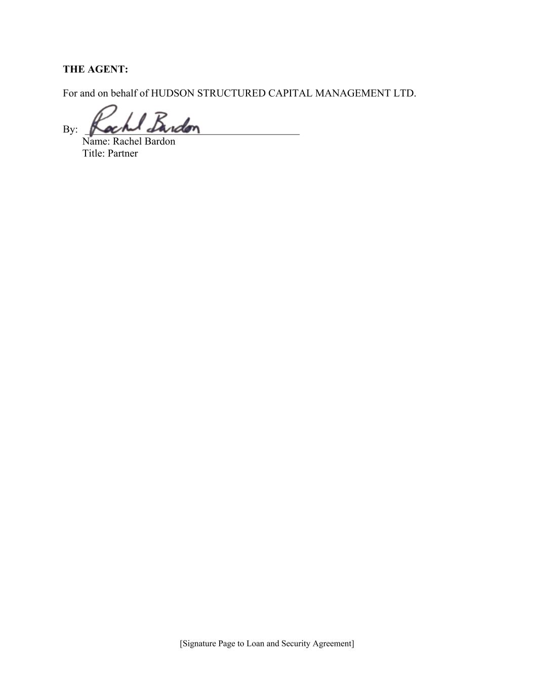 [Signature Page to Loan and Security Agreement] THE AGENT: For and on behalf of HUDSON STRUCTURED CAPITAL MANAGEMENT LTD. By: _________________________________________ Name: Rachel Bardon Title: Partner