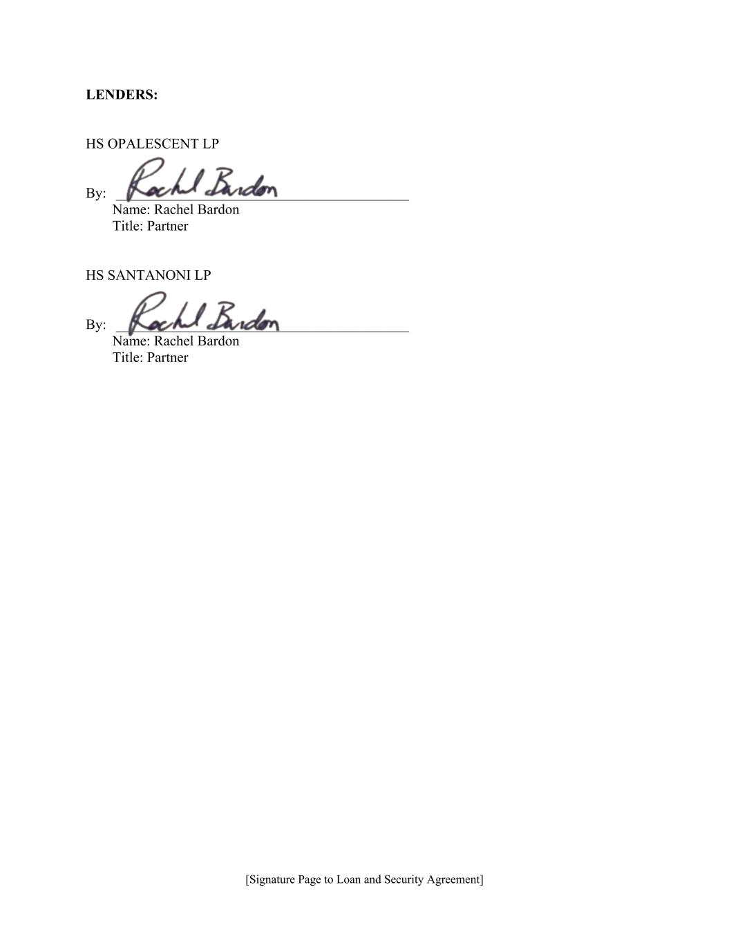 [Signature Page to Loan and Security Agreement] LENDERS: HS OPALESCENT LP By: _________________________________________ Name: Rachel Bardon Title: Partner HS SANTANONI LP By: _________________________________________ Name: Rachel Bardon Title: Partner