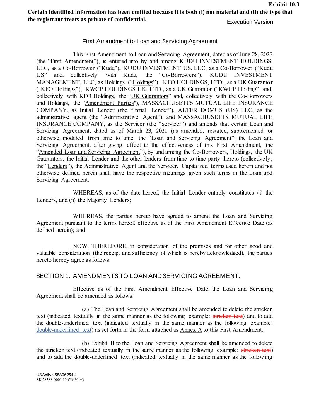 Execution Version USActive 58806254.4 SK 28388 0001 10656491 v3 First Amendment to Loan and Servicing Agreement This First Amendment to Loan and Servicing Agreement, dated as of June 28, 2023 (the “First Amendment”), is entered into by and among KUDU INVESTMENT HOLDINGS, LLC, as a Co-Borrower (“Kudu”), KUDU INVESTMENT US, LLC, as a Co-Borrower (“Kudu US” and, collectively with Kudu, the “Co-Borrowers”), KUDU INVESTMENT MANAGEMENT, LLC, as Holdings (“Holdings”), KFO HOLDINGS, LTD., as a UK Guarantor (“KFO Holdings”), KWCP HOLDINGS UK, LTD., as a UK Guarantor (“KWCP Holding” and, collectively with KFO Holdings, the “UK Guarantors” and, collectively with the Co-Borrowers and Holdings, the “Amendment Parties"), MASSACHUSETTS MUTUAL LIFE INSURANCE COMPANY, as Initial Lender (the “Initial Lender”), ALTER DOMUS (US) LLC, as the administrative agent (the “Administrative Agent”), and MASSACHUSETTS MUTUAL LIFE INSURANCE COMPANY, as the Servicer (the “Servicer”) and amends that certain Loan and Servicing Agreement, dated as of March 23, 2021 (as amended, restated, supplemented or otherwise modified from time to time, the “Loan and Servicing Agreement”; the Loan and Servicing Agreement, after giving effect to the effectiveness of this First Amendment, the “Amended Loan and Servicing Agreement”), by and among the Co-Borrowers, Holdings, the UK Guarantors, the Initial Lender and the other lenders from time to time party thereto (collectively, the “Lenders”), the Administrative Agent and the Servicer. Capitalized terms used herein and not otherwise defined herein shall have the respective meanings given such terms in the Loan and Servicing Agreement. WHEREAS, as of the date hereof, the Initial Lender entirely constitutes (i) the Lenders, and (ii) the Majority Lenders; WHEREAS, the parties hereto have agreed to amend the Loan and Servicing Agreement pursuant to the terms hereof, effective as of the First Amendment Effective Date (as defined herein); and NOW, THEREFORE, in consideration of the premises and for other good and valuable consideration (the receipt and sufficiency of which is hereby acknowledged), the parties hereto hereby agree as follows. SECTION 1. AMENDMENTS TO LOAN AND SERVICING AGREEMENT. Effective as of the First Amendment Effective Date, the Loan and Servicing Agreement shall be amended as follows: (a) The Loan and Servicing Agreement shall be amended to delete the stricken text (indicated textually in the same manner as the following example: stricken text) and to add the double‐underlined text (indicated textually in the same manner as the following example: double‐underlined text) as set forth in the form attached as Annex A to this First Amendment. (b) Exhibit B to the Loan and Servicing Agreement shall be amended to delete the stricken text (indicated textually in the same manner as the following example: stricken text) and to add the double‐underlined text (indicated textually in the same manner as the following Certain identified information has been omitted because it is both (i) not material and (ii) the type that the registrant treats as private of confidential. Exhibit 10.3